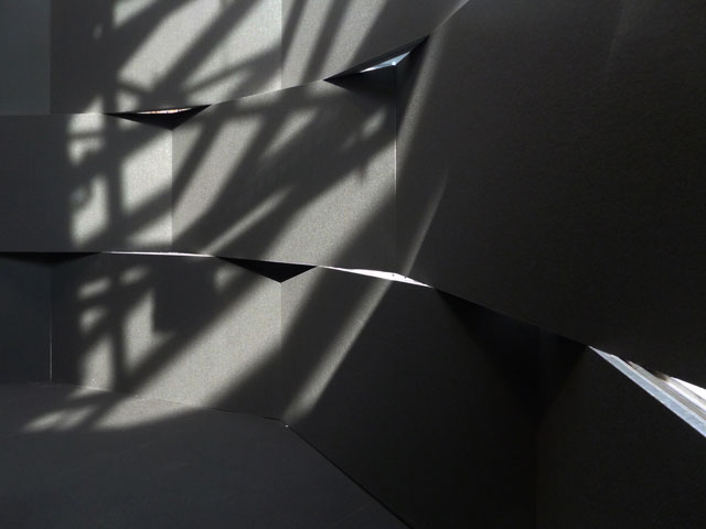 In den innenliegenden Bereichen bilden schwarze Stoffoberflächen eine ruhige Klarheit. Diese veredelte Benutzeroberfläche wird von der eindeutigen Geometrie der Raumelemente noch verstärkt. Die dunkle Klarheit in den Innenräumen betont den Kontrast zwischen dem Hintergrund der Architektur und der Lebendigkeit der Benutzer.