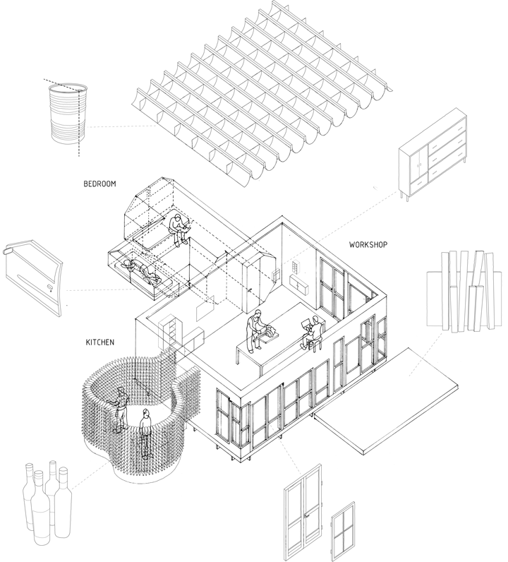 The building is composed as a collage: A kitchen entirely build out of old bottles, the sleeping room with walls from used car doors, the workshop using wooden windows and old furniture and the main roof set from old oil barrels and used dry wall profiles.