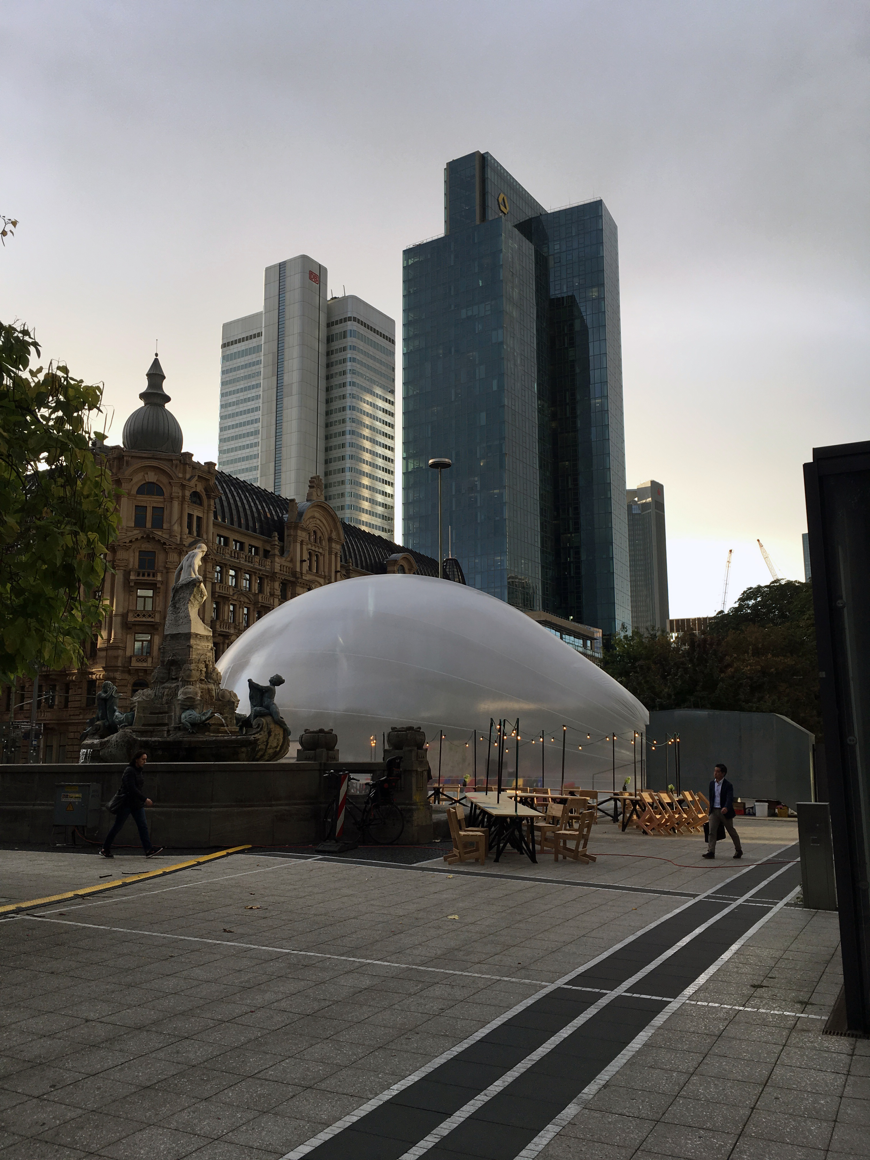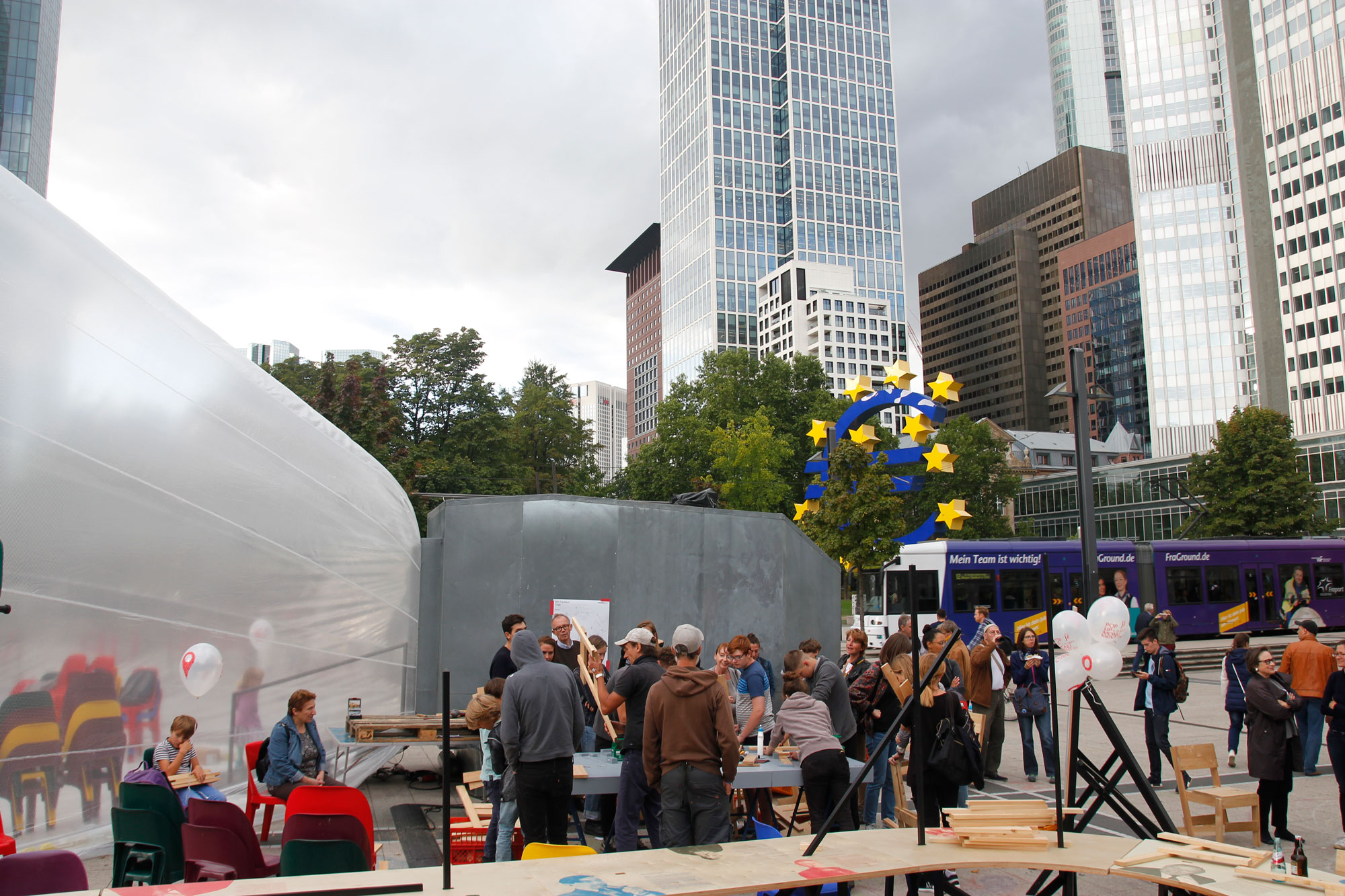 The Museum Judengasse wanted to bring the museum to the city, to attract attention. In an echo to the history of the jewish tradition of temporary builings the bubble gets inflated again every morning. For the initiators the bubble symbolises the fragile character of jewish places in history. The museums´shielded room is brought to a transparent and open place. The visitors have the possibility to participate in the planning of the new Jewish Museum through different ways of voting.