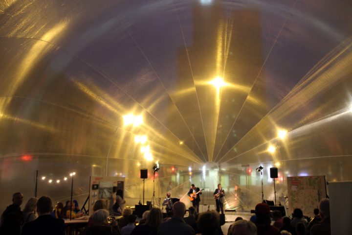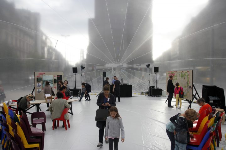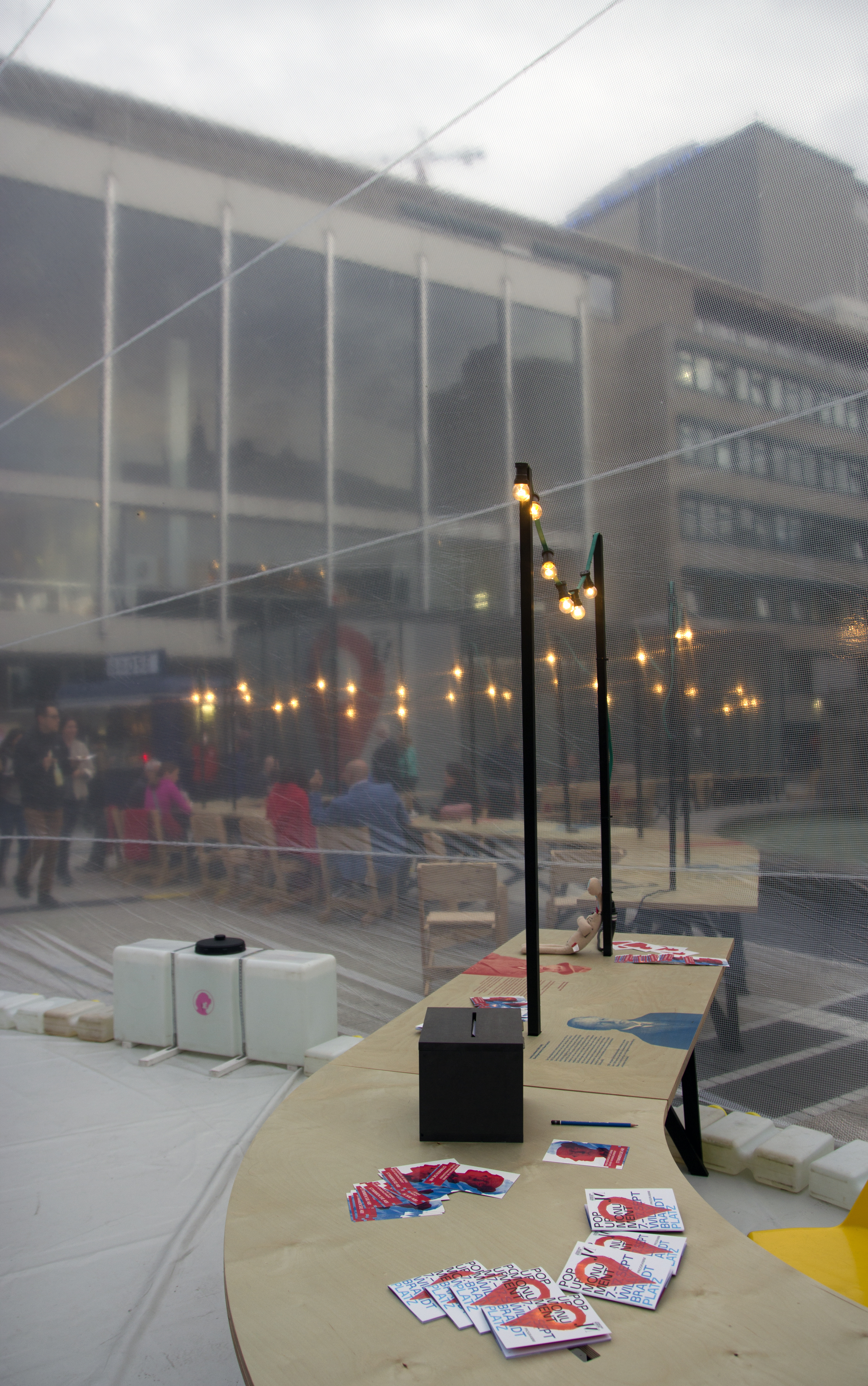 The line of tables meanders along the fountain into the interior of the Popup Monument. Pictures and short bios of famous jewish personalities are printed onto the tabletops. The visitors could vote for whom they want to learn more about in the future jewish museum. The curators are sitting at a table inside the bubble, welcoming visitors to an open discussion.