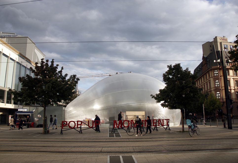 Der Wunsch des Museum Judengasse war es, das zukünftige Jüdische Museum schon jetzt in die Stadt zu holen. Die Blase wird, in Anlehnung an die jüdische Tradition temporärer Bauten, jeden Tag aufs Neue aufgeblasen. Für die Initiatoren symbolisiert das Popup-Monument den fragilen Charakter jüdischer Orte. Der abgeschirmte Schutzraum des Museums wird an einen transparenten, offenen Ort gebracht. Die Besucher können sich an der Gestaltung des Popup-Museums beteiligen. Ein langes Tischband schlängelt sich am Brunnen vorbei bis ins Innere des Küchenmonuments. Auf die Tischplatten sind Informationen über Persönlichkeiten der jüdischen Geschichte gedruckt – alle Besucher sitzen mit berühmten jüdischen Persönlichkeiten an einem Tisch. An einem Tisch im Innenraum sitzen die Kuratoren, die von Besuchern befragt werden können und für Gespräche zur Verfügung stehen. Die Gäste können abstimmen, über wen sie im zukünftigen Jüdischen Museum mehr erfahren möchten.