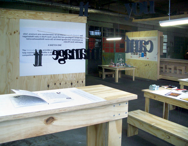 Raumgestaltung und -architektur für die Ausstellung zu „Produkt und Vision“. Ausgehend vom Archetyp des Tisches wurden für die Exponate von 20 Künstlern und Künstlergruppen Ausstellungsmöbel realisiert. Durch die Veränderung seiner Konstruktionselemente: Platte, Zarge, Bein – in Maßstab und Anordnung – wird ein Raumkontinuum geschaffen, das als ein Ausschnitt aus dem Feld der Möglichkeiten funktioniert.