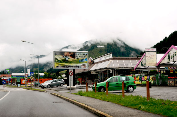 Die zweite Präsenz ist die Stadt entlang der Bundesstraße. Diese stets als Rückseite oder Funktionszone gelesene Seite der Stadt ist andererseits genau das, was der durchreisende Autotourist von der Stadt zu sehen bekommt. Die Schrift “ZUKUNFT” wird sowohl Teil der Postkartenansicht der historischen Stadt als auch zum Wegzeichen für die Autofahrer. Außerdem wird sie vom Parkplatz des Supermarktes sichtbar sein, wo sich Jugendliche mit starken Autos treffen.