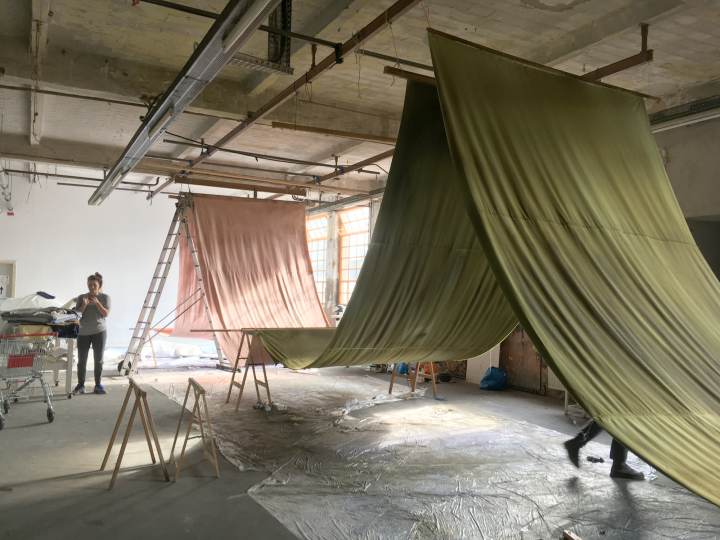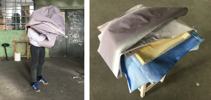 Die Bilder zeigen den Prozess des Färbens der raumbildenden Elemente. Im Kontrast zu der kühlen Materialität der Wickelfalzrohre stehen weiche Textilien aus farbenfrohem und selbst gefärbtem Material. Sie können Räume bilden oder im nächsten Moment wieder zu Seite geschoben werden und das System unterbrechen. Die Textilien sind von Hand gefärbt, zerschnitten und neu zusammengenäht.