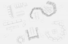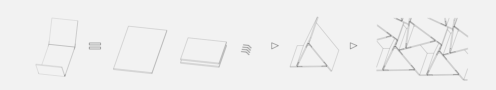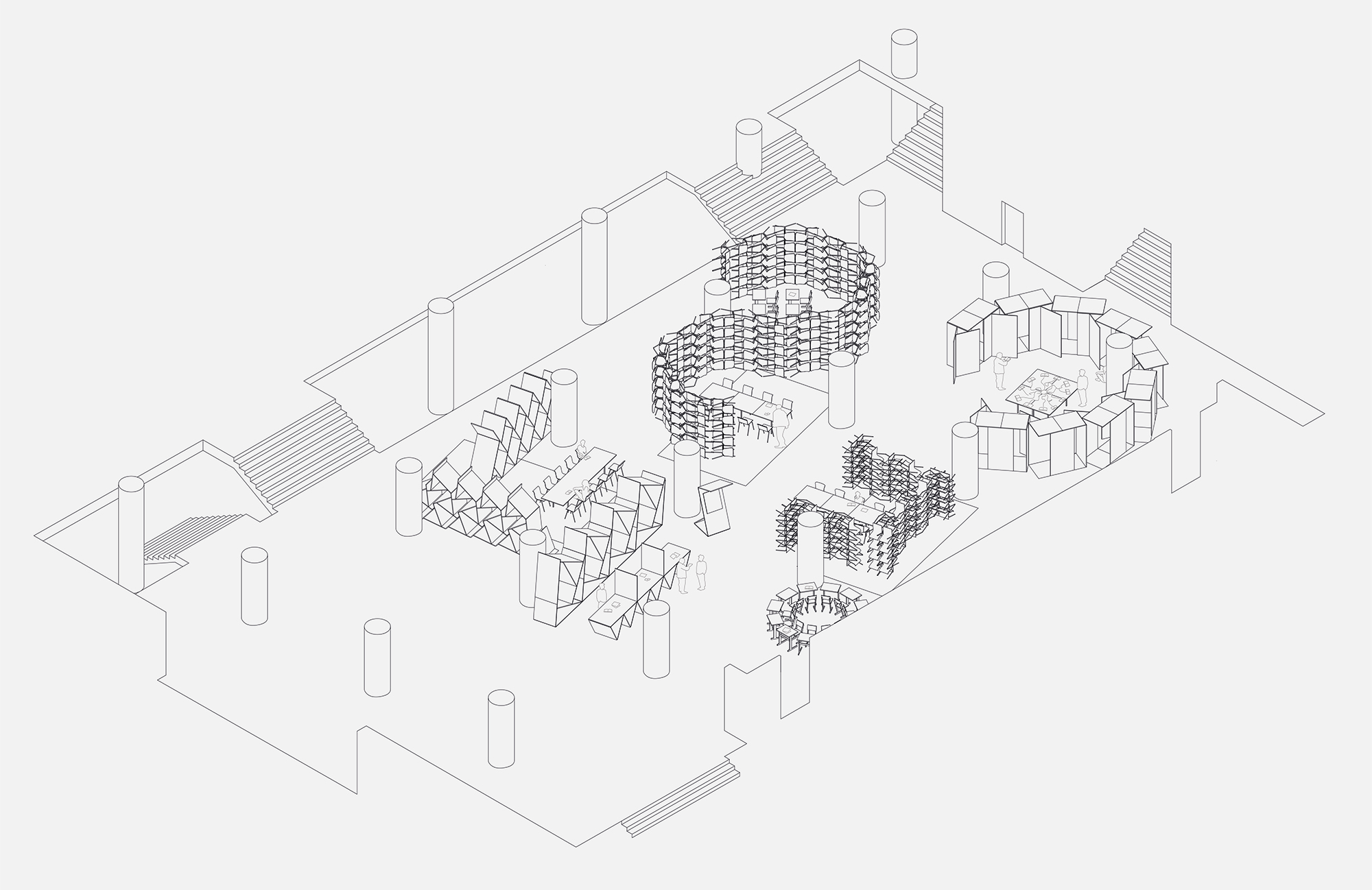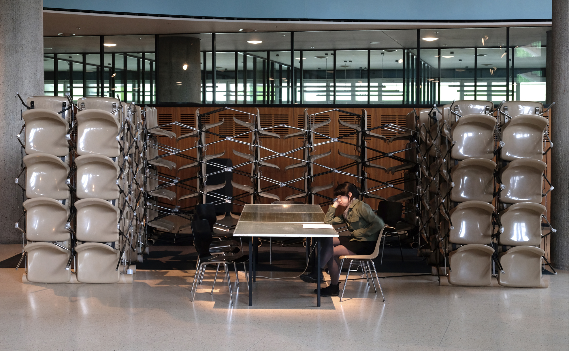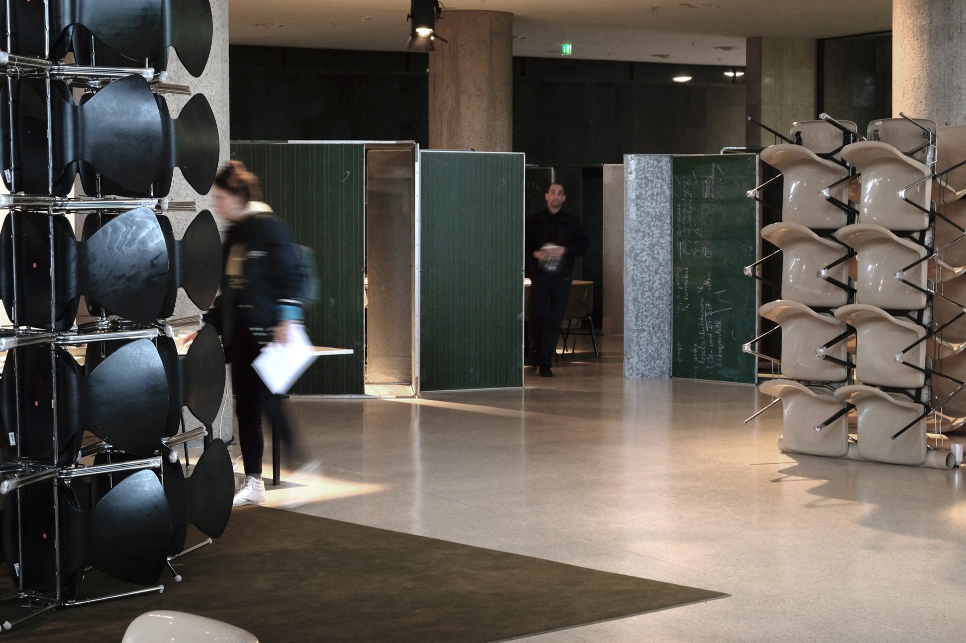 For the opening conference raumlabor create an installation for the Foyer of the HKW redefining the spatial setup of a classroom. The foyer is zoned temporarily in several niches and retreats with different spatial qualities. During the two days of the conference the participants occupy the spaces testing different formats of learning. The concept for the setup is based on the accumulation of big amounts of the same element. Three models of chairs as well as recycled chalkboards, stacked in various ways, generate a set of different separating walls.