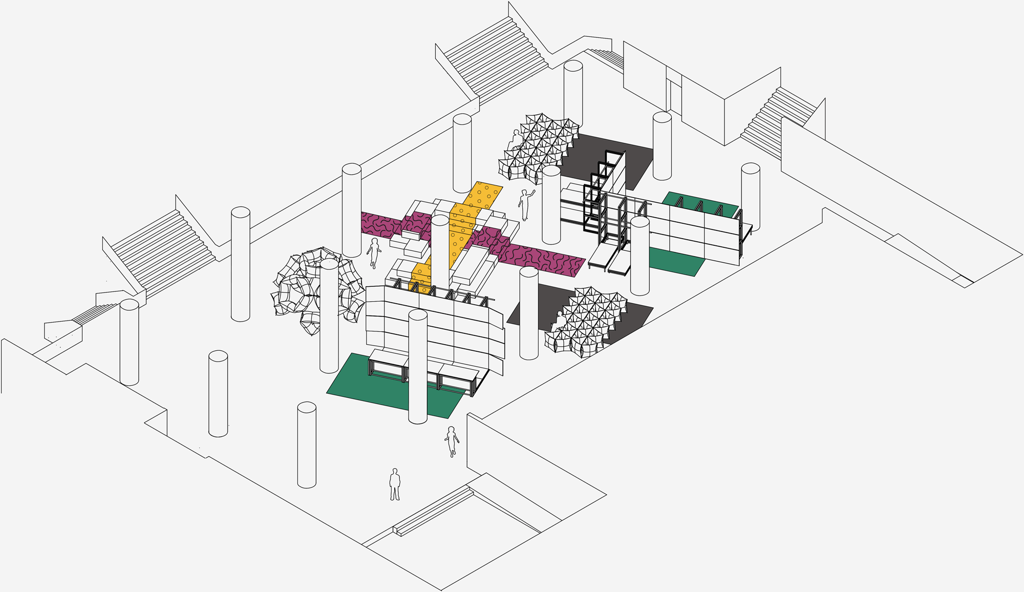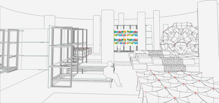 In June 13.-14., 2018 the HKW was transformed into the School of Tomorrow. raumlabor created an installation for the Foyer, a place for the students to learn, create and meet.