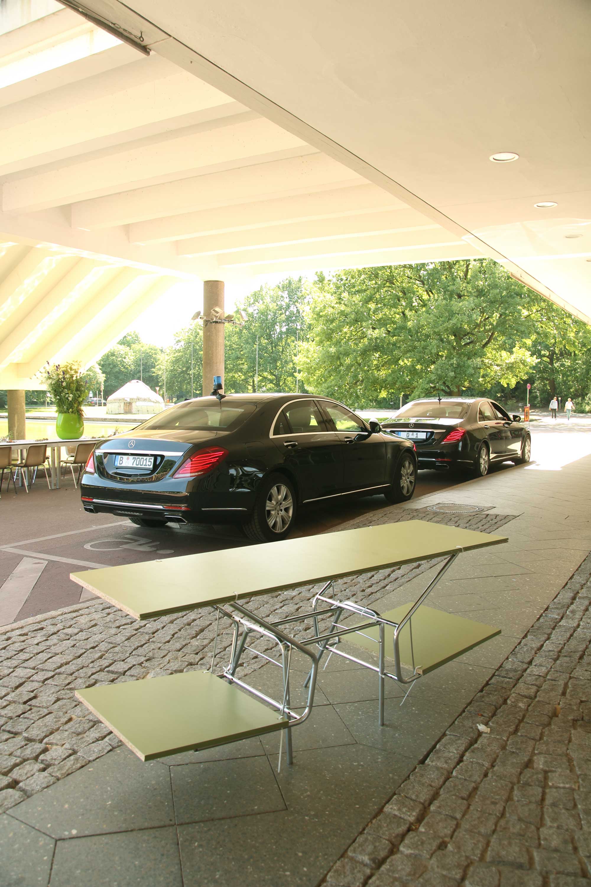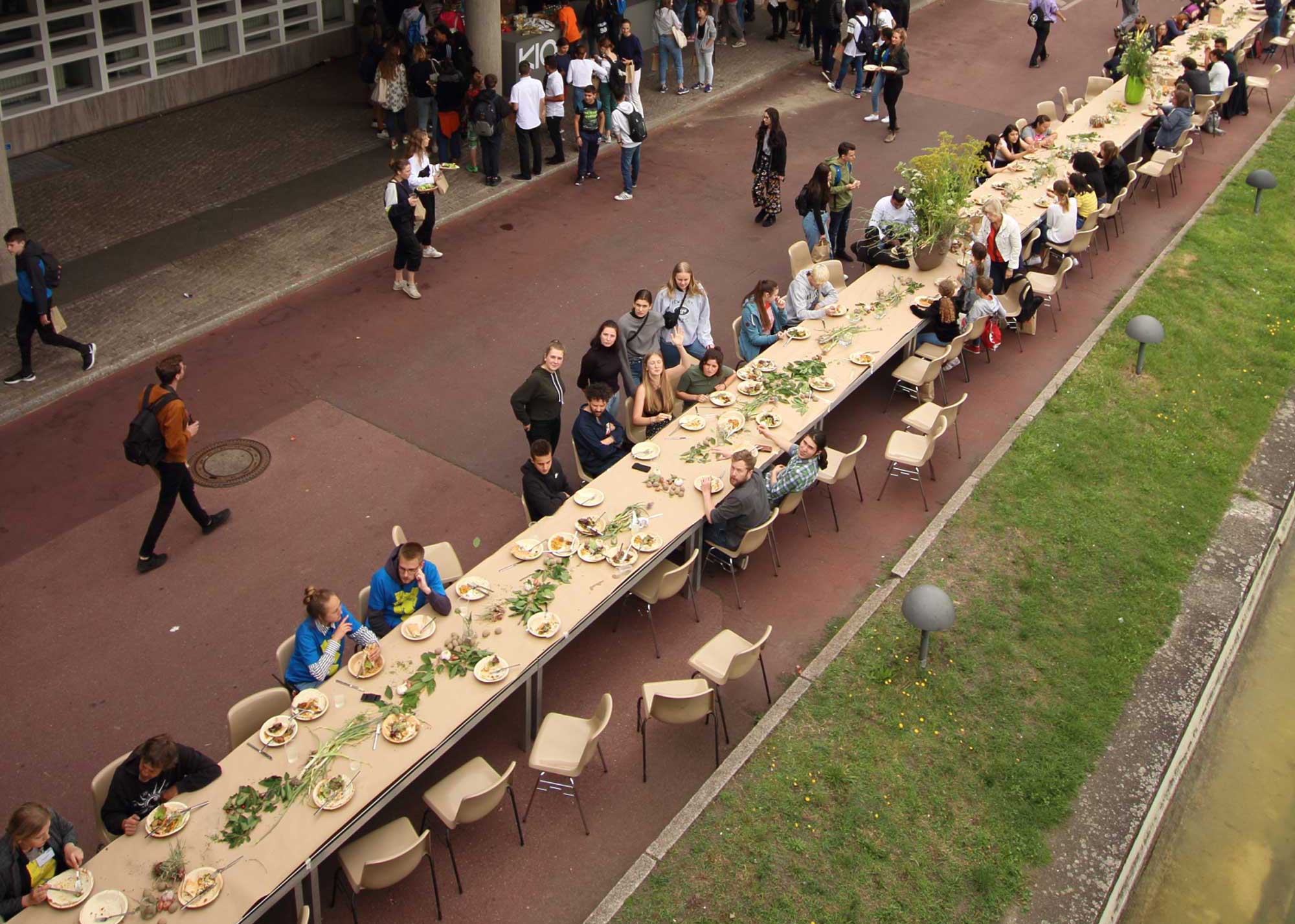 Lunch on Wednesday was transported outside in front of the main entrance of the HKW. raumlabor provided a long table, scanning the length of the facade, to ensure that all students could sit around one table.
