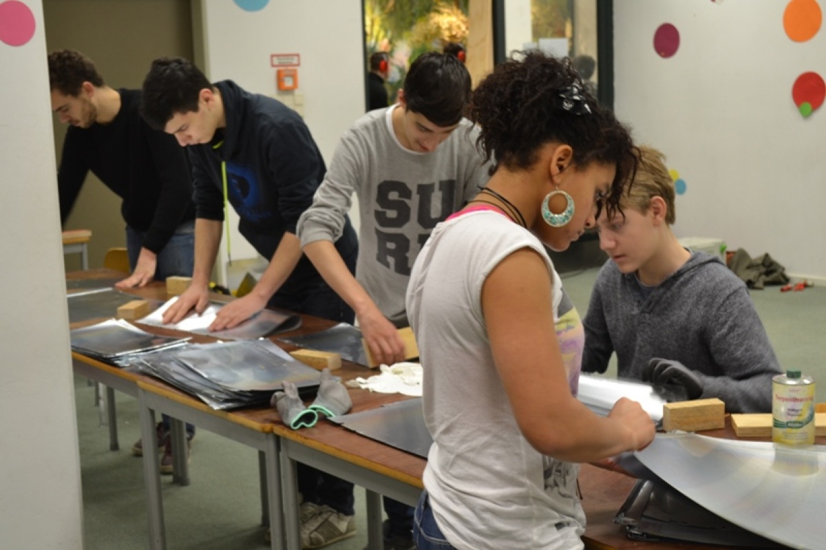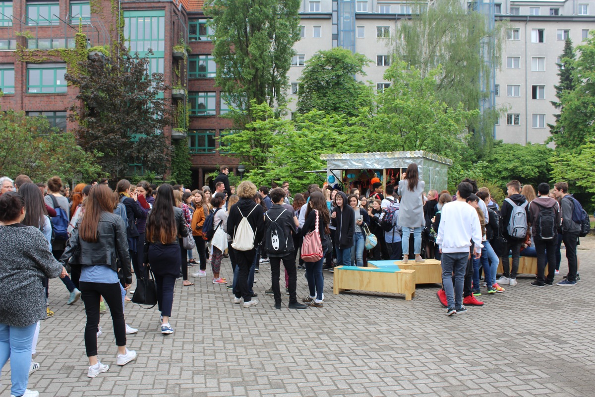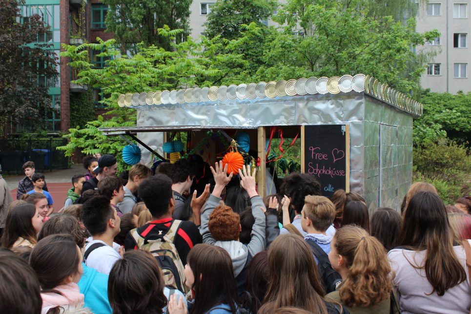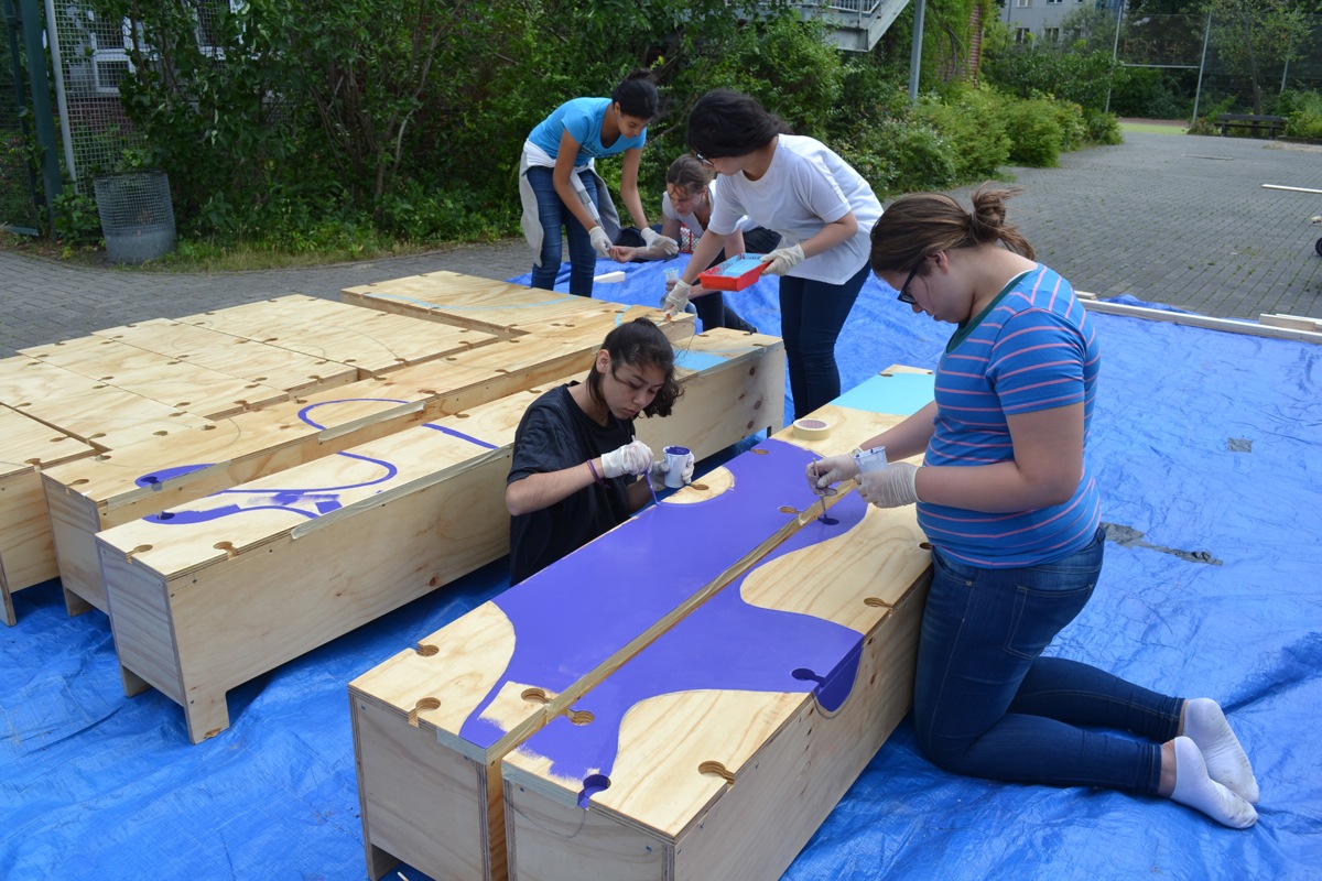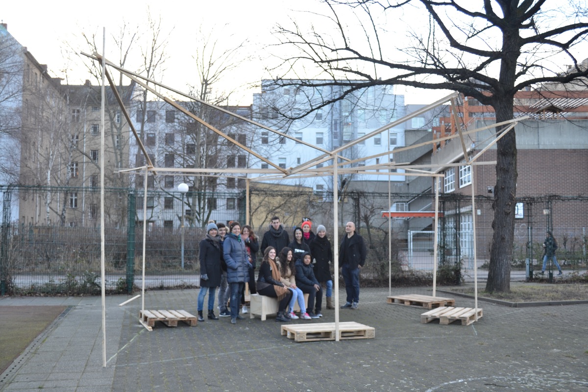 auf dem Schulhof gemeinschaftlich gebaut. Die Holzplatten wurden vor Ort geschnitten und mit einer innen liegenden Holzträger-Struktur verstärkt.