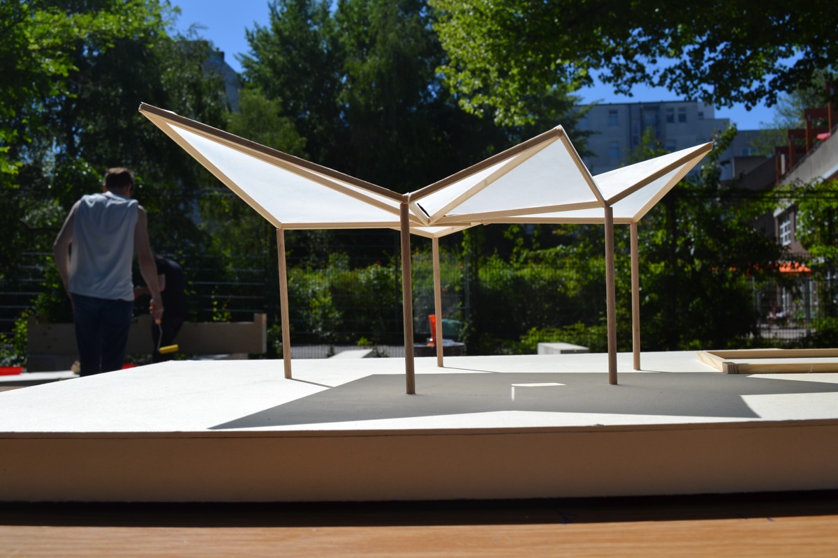 Die Schüler haben zusammen mit Architekten, Mitarbeitern, Kulturagenten, ihrer Kunstlehrerin den Kiosk zusammengesetzt. Nach und nach hat man schon einen ersten