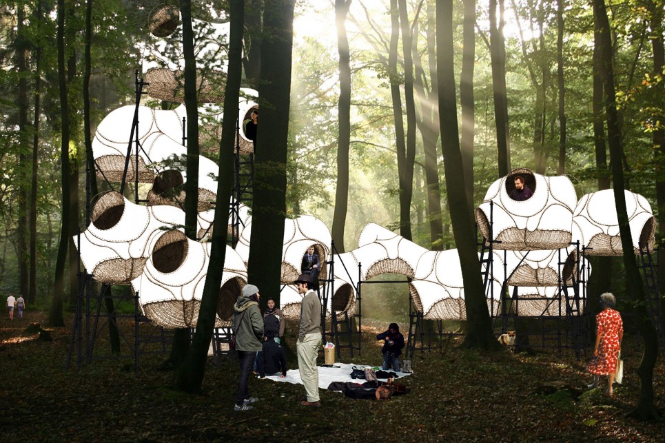 Liebe Mama, diesmal brauchst du Dir um mich wirklich keine Sorgen zu machen. Weder haben mich die Veranstalter von der Fortbildung hier in Paris wieder, wie neulich in New York in so einer Junkie Absteige untergebracht, noch muss ich wie letztes Jahr bei dem Managerkurs in Warschau im Armeezelt schlafen. Diesmal habe ich ein komfortables Zimmer mitten im Park de la Villette mit Blick auf den Canal Saint Martin. Das Bett ist kuschelig bequem, der Service erstklassig und wenn ich aufwache piepsen vor meinem Fenster fröhlich die Vögel. Zugegeben die Form ist etwas ungewohnt: das Hotel hat 32 Doppelzimmer aus Weidengeflecht in die man durch eine runde Öffnung hinein krabbeln muss. Das musst Du Dir irgendwo zwischen Hamsterbau und Schwalbennest vorstellen. Die Zimmer hängen in einem Gerüst und sind über Tunnel miteinander verbunden, würdest Du jetzt nebenan wohnen, könnten wir uns abends immer besuchen, wie zuhause. Das Hotel passt sich der Landschaft an, es windet sich um Bäume, überbrückt einen Bambuswald und endet am Kanal, wo mein Zimmer ist. Es ist so schön, das ich fast nicht mehr zum Kongress gehen mag. Zum Glück ist der gleich nebenan in der Cité de Science. Aber keine Angst ich komm zurück, das Hotel wird nämlich gleich nach dem Kongress wieder abgebaut und zieht weiter nach Graz, wo ein großes Festival Unterkünfte für die Künstler braucht. Weist Du noch wie wir am Schlossberg unterm Uhrturm gestanden haben? Genau dort soll es aufgebaut werden. Tolle Vorstellung. Vielleicht sollte ich jetzt doch Künstler werden, wie Du immer gesagt hast?