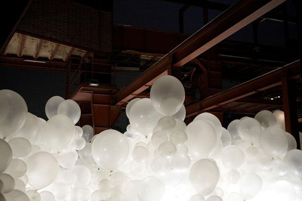 The dense foam is illuminated from within. It is made of transparent, oversized latex balloons, some filled with helium and some with air.