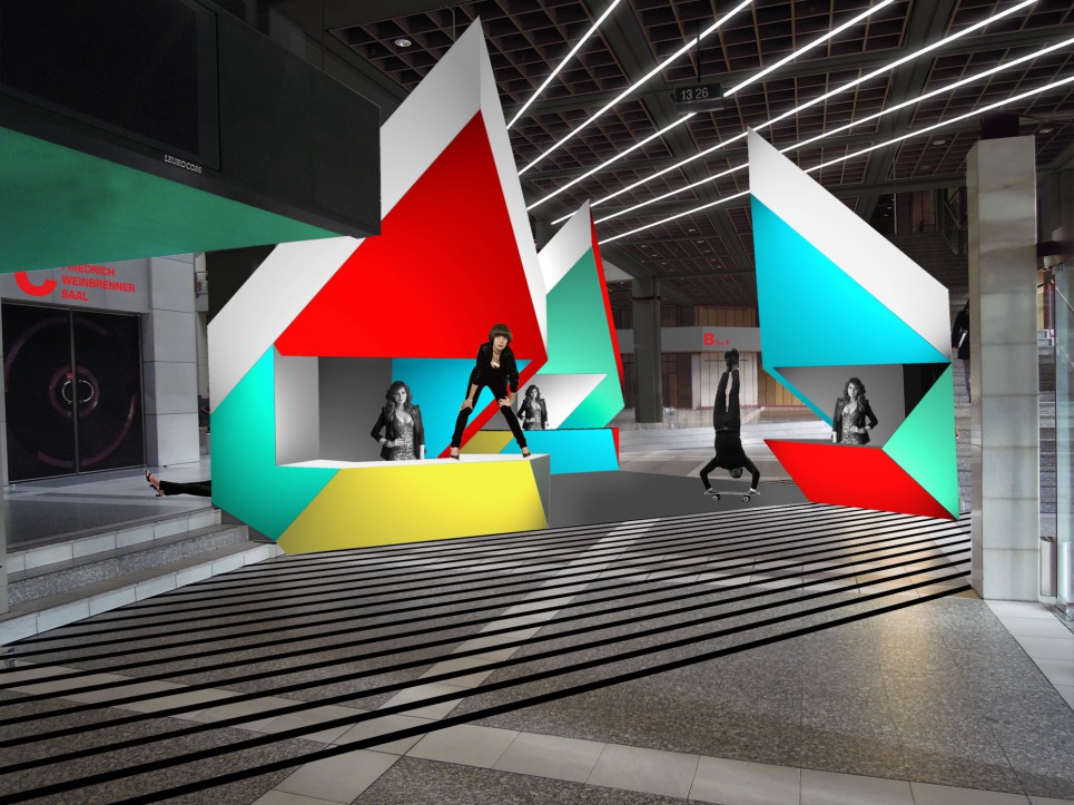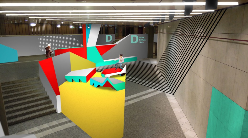 Weinbrenner steht für eine Gruppe fest eingebauter, raumgreifender Körper in den Foyers, Gilly für mobile tresenartige Objekt und Schinkel für die kleinsten, die Sitzelemente. Die Benennung macht deutlich, daß die Objekte einem gemeinsamen Geist entspringen, aber persönliche Charaktere entwickeln. Verwandt und doch unterschiedlich. Die neuen Raumkörper bringen die Diagonale zurück in den entlehrten Raum der Stadthalle. Sie behaupten sich damit gegen die ordnende Macht des Rasters, überspringen und verknüpfen die vorgegebenen Ordnungssysteme und öffnen damit einen imaginären Raum neuer Möglichkeiten. Sie aktualisierne das ewige Spannungsverhältnis von Freiheit und Kontrolle. Sie sind dizipliniert geometrisch, kontrolliert in der Platzierung der Farbflächen und doch frei. Ihre komplexere Geometrie lehnt sich an den Bestand an und führt ein dort angelegtes Prinzip zu neuer Sichtbarkeit und Attraktivität.