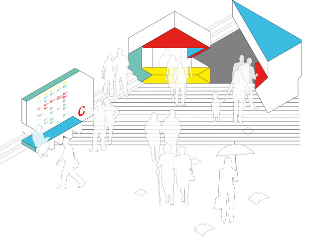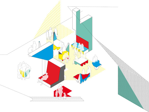 Die Orte an denen interveniert wird sind sorgfältig gewählt und in umfangreichen Variantenstudien überprüft. Die Interventionen schaffen neue Kristallisationsorte in der diffusen Offenheit der Foyerbereiche. Sie schaffen Blickpunkte, Adressen und bieten die Möglichkeit sich selbst in den Raum einzuschreiben. Sie dienen als Landmarks und Aufenthaltsorte zugleich.
