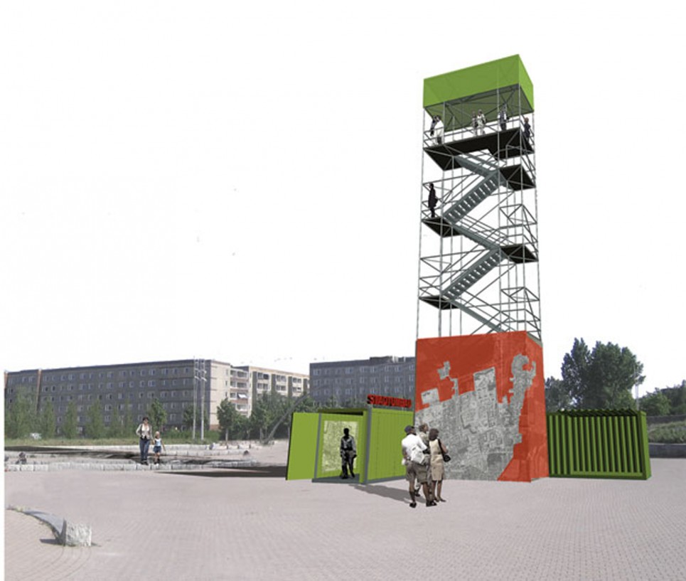 Neu-Schmellwitz is a pre-fabricated residential area in north Cottbus, built in the 1980s. The area is characterized by large percentages of vacancy. Within the context of a workshop on open space design and temporary use, we suggested accompanying the dismantling process of the area by diverse cultural initiatives. An important aspect was to strengthen public exchange between residents and actors. We suggested installing an info-café and a lookout tower for that purpose.