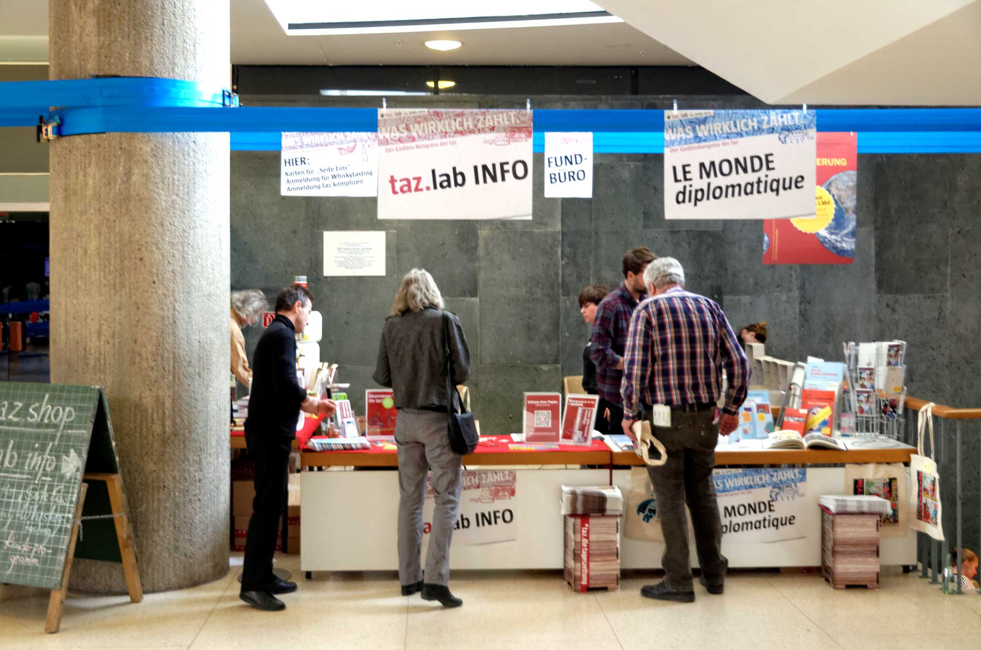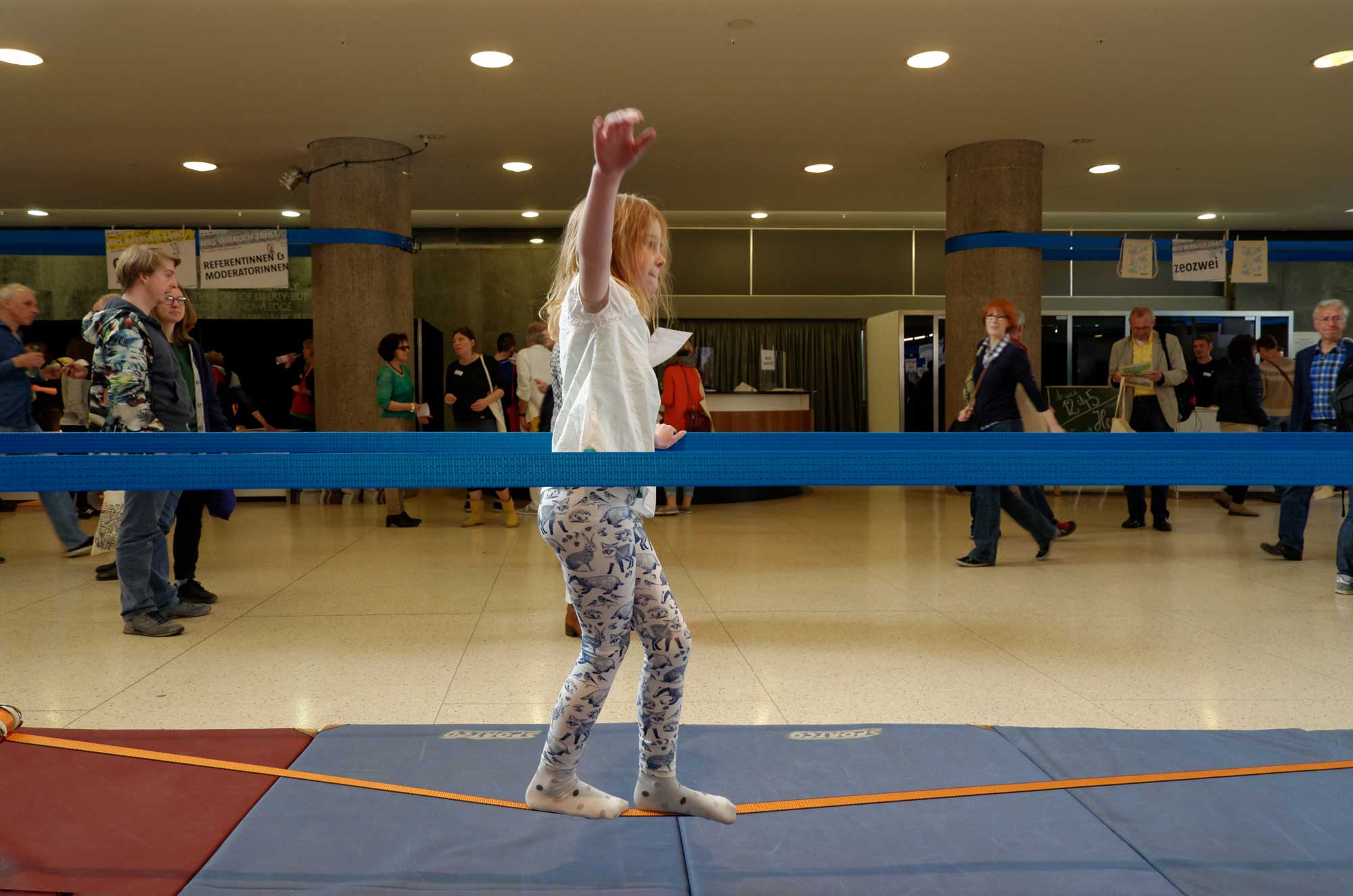 Im Taz Kinderbereich bieten drei große umgebaute Tafeltisch genügend Fläche zum malen. Eine Bibliothek und eine Slackline zum Balancieren ergänzen das Beschäftigungsangebot für die kleinen Besucher.