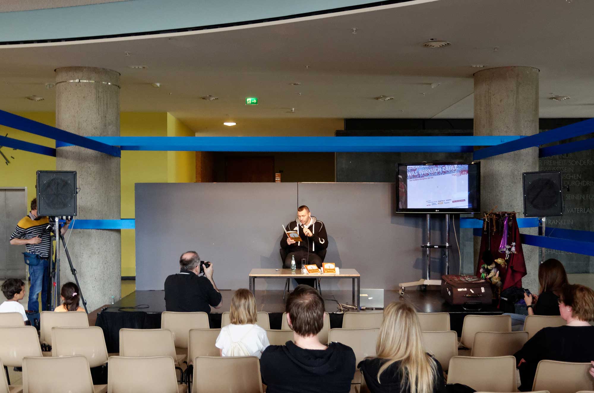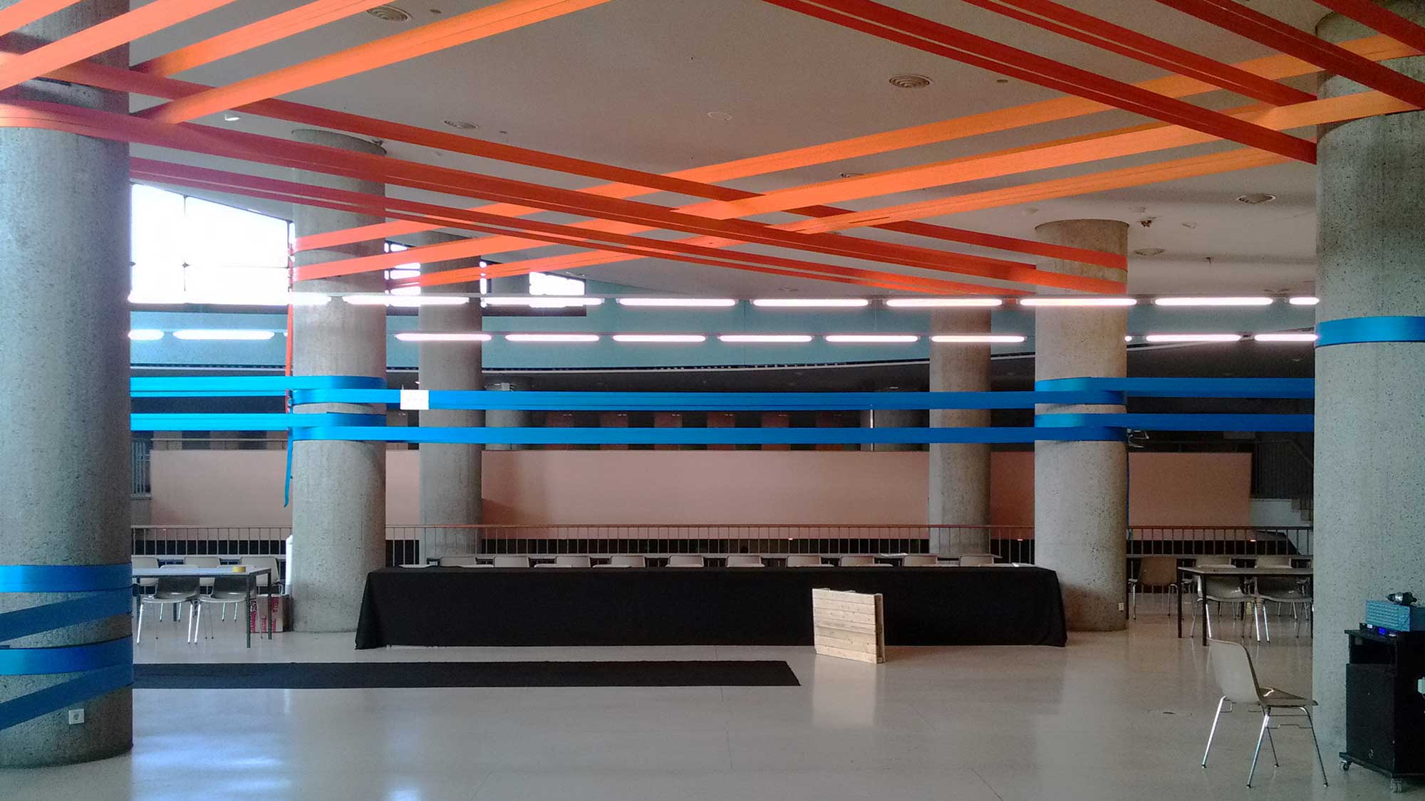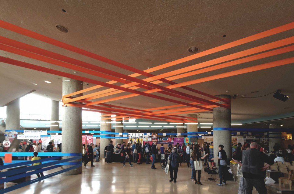 Im Rahmen des taz.lab – Kongresses am 25.04.2015 wurde das Foyer des HKW’s zum dritten mal Begegnungsstätte für einen kreativen Austausch, der in diesem Jahr unter dem von Altbundeskanzler Gerhard Schröder geprägten Begriff “Gedöns” abgehalten wurde. Grundidee des Entwurfs beinhaltet die Generierung einer netzartigen Struktur, die das Foyer entsprechend des Raumprogramms neu gliedert und je nach Zielgruppe Möglichkeiten der Interaktion bietet. Als Material werden Spanngurte in den Farben Blau und Orange verwendet, die um die Foyersäulen herumgelegt und über Ratschen fixiert werden.