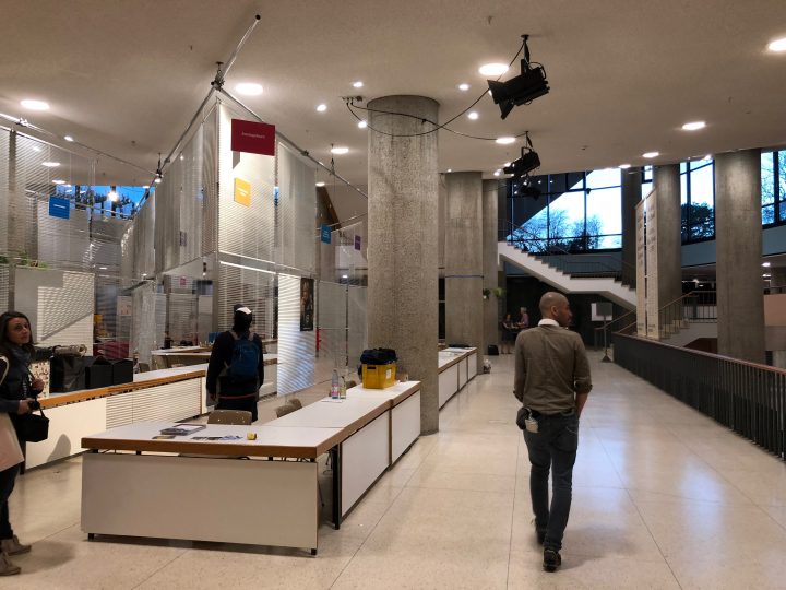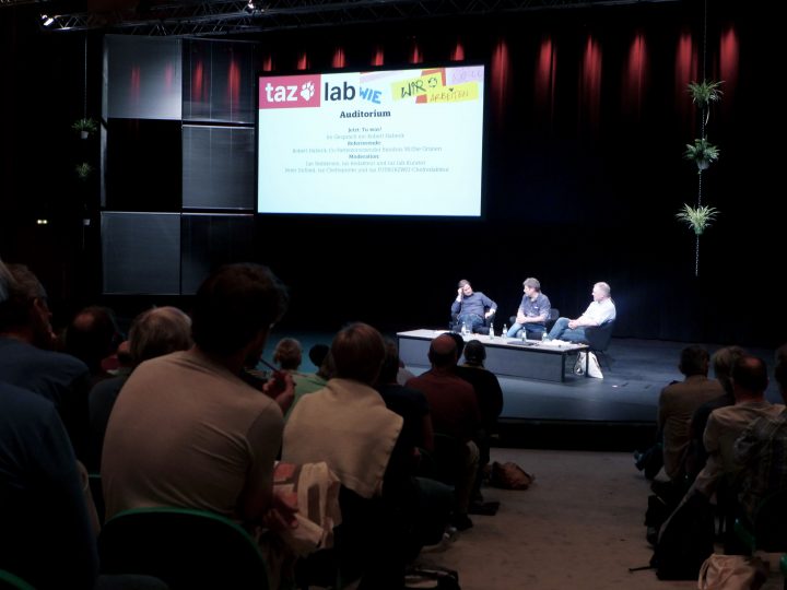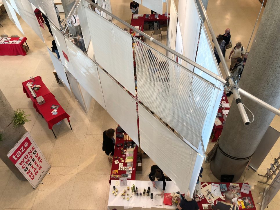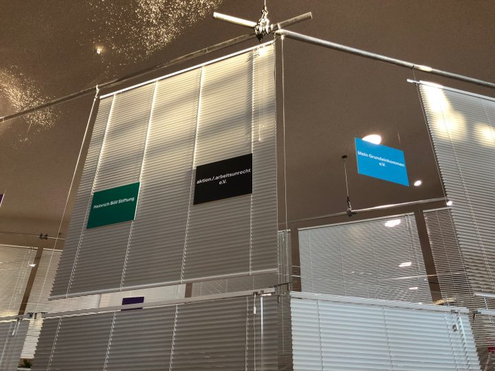 Unsere Rauminstalltion für das Taz-Lab „Wie wollen wir Arbeiten?“ verschiebt das HKW-Foyer in eine Bürolandschaft. Diese Reminiszenz dient als Sprungbrett für die Frage wo geht es hin mit unserem Arbeitenden Tun. Das Büro und seine räumliche Gestaltung werden in einer digitalen Gesellschaft mehr und mehr aufgelöst, ohne eine Aussicht auf eine neue Ästhetik des Arbeitens. Jalousien fungieren als Bildträger einer vergangenen Zukunft. Mit ihren leichten, abwaschbaren Oberflächen, ihren regelmäßigen Linien (wenn alles funktioniert) und den signifikanten Störungen (wenn die Jalousie wieder mal nicht richtig rutscht) öffnen sie einen Assotiatinsraum in bekannte und unheimliche Arbeitsweltfantasien.
