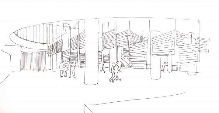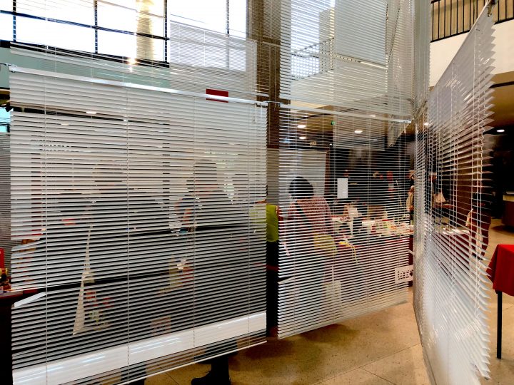 Die Jalousien hängen als einziges raumbildendes Element wie Wände von der Decke, was ihre Funktion erweitert und gleichzeitig verfremdet. Beweglich, filigran, bildet die Installation nur eine Scheingrenze im Marktbereich des Kongresses. Ein bekanntes aber unvollständiges und unsicheres Gefühl schwebt im Raum. Der Aufbau folgt zwei Richtungen, die sich immer wieder schneiden. Eine verläuft parallel zur Tragstruktur des Hauses, die andere ist in einem 30 Grad Winkel diagonal dazu ausgerichtet. So entstehen scharfe, kantige Geometrien in der aufgelösten Bürowelt. Die drei unterschiedlichen Höhen der Aufhängung trennen die begehbaren Bewegungsräume von den Hinterbereichen der Markstände und verlaufen parallel zu der Neigung des darüberliegenden Auditoriums.