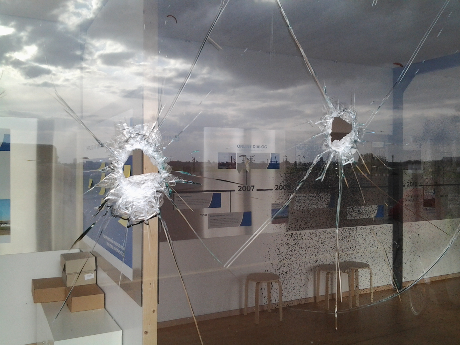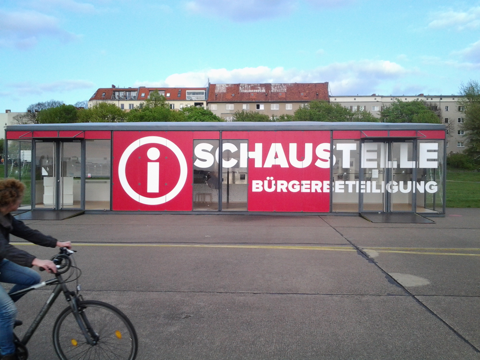 April 2014: Nahe dem Zugang Oderstraße findet man eine Art Containergebäude mit der Aufschrift „Bürgerbeteiligung“. Innen findet man eine hochwertig angefertigte Zeitleiste der verschiedenen Maßnahmen der Bürgerbeteiligung. Offensichtlich gibt es unterschiedliche Meinungen über angemessene Bürgerbeteiligung. Mitte April: die Fenster des Pavillons haben Löcher und die Zeitliste hat eine schwarze Farbschicht bekommen. Anfang Mai: die Scheiben sind wieder heile, der Pavillon zeigt jetzt die Aufschrift „Ausstelle Bürgerbeteiligung“ – perfekt.