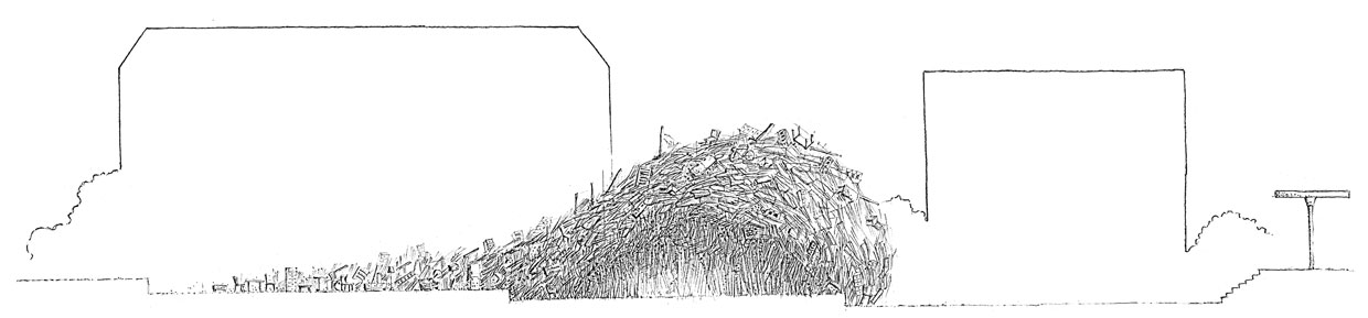 The idea is to assemble a kind of swarm of common items which have been cast away in the Georg-Büchner-Anlage. These things condense in direction of the theatre to a sort of ball which seems to roll towards the building. It is possible to enter this ’whirlpool’.