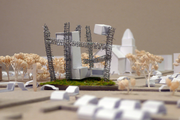 In awareness of the outstanding qualities of the site the first reaction for the design of the pavilion was to work with perfect geometries.  As the water is missing in the site, the construction of an abstract body could be read as an attempt to re-insert a new entity as a whole.