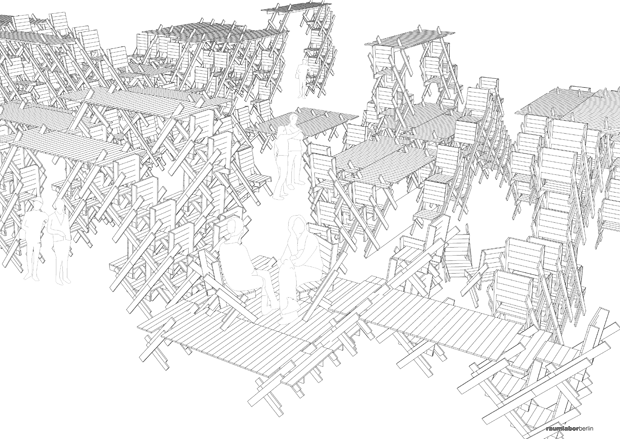 THE GENERATOR is an experimental building laboratory for instant, participatory building practices in public space. Central issues of the research include: construction principles, new geometries for furniture and lightweight construction buildings, as well as new use possiblities and multiple programs for people to meet and interact in public.