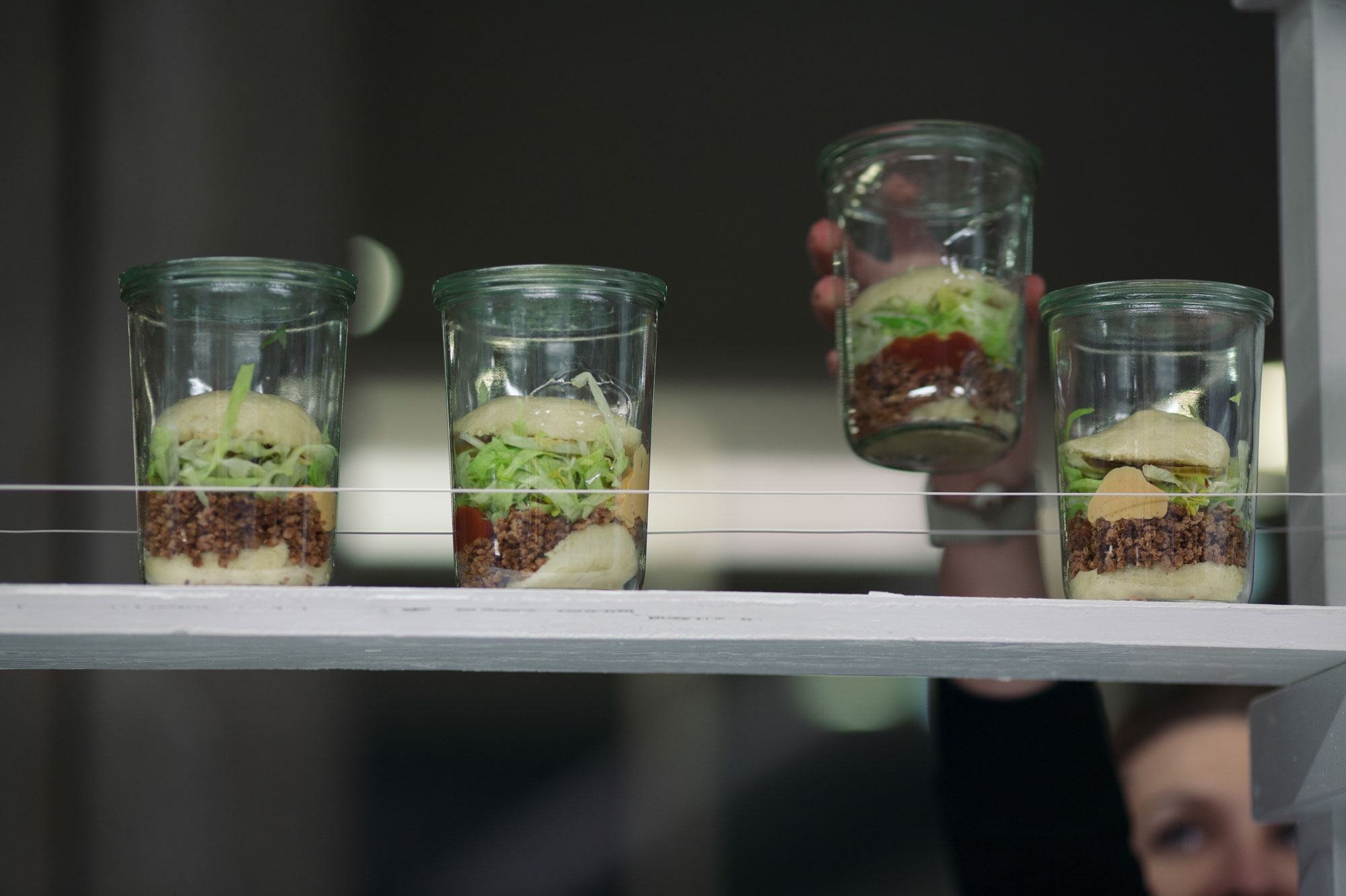 The guests are invited to pick up their portions at the distribution platform next to the entrance. Microwave ovens are provided for adjusting the temperature of the dish as desired.To avoid damage to humans and machines, please note that no metal lids or clips must be put into the microwaves.