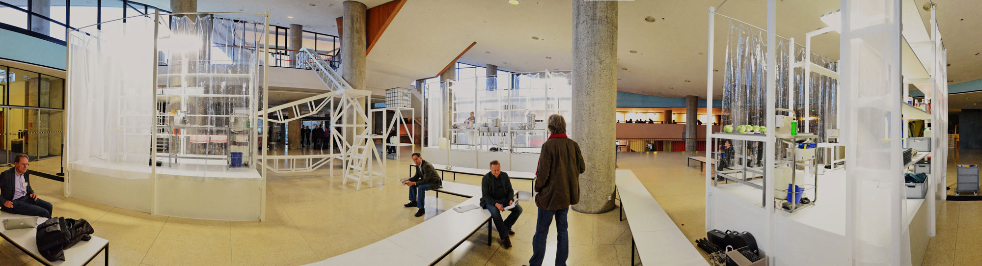 The metabolic kitchen is inspired by the simultaneity of food cultures in contemporary food production. Plants and animals are raised in mechanized, industrial plants and then harvested, slaughtered and processed more or less automatically. At the same time, urban gardeners start raising their own locally grown food while regional farmers produce organic goods. In a city like Berlin, with it’s multitude of lifestyles, these contradicting ways of understanding food coexist naturally.