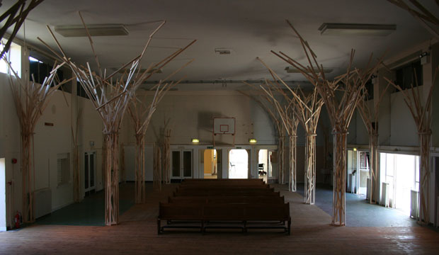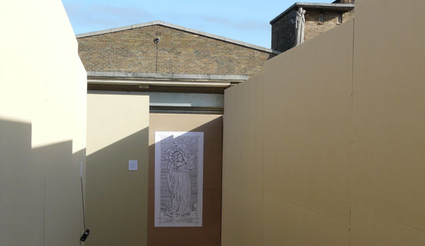 Als Eingang bauten wir das Labyrinth nach, das Nash für die englische Seite der Parkanlage geplant hatte. Von hier ging eine Blickachse durch die gesamte Ausstellung auf das Jantar Mantar, das obskure, indische Observatorium, das wir unter großen Mühen auf Carolina Warf errichteten. Die Architektur wurde von uns mit einer Kamera Obscura ergänzt, auf deren Projektion man einen Schriftzug auf dem Dach der Schule sah: DNE EHT – THE END