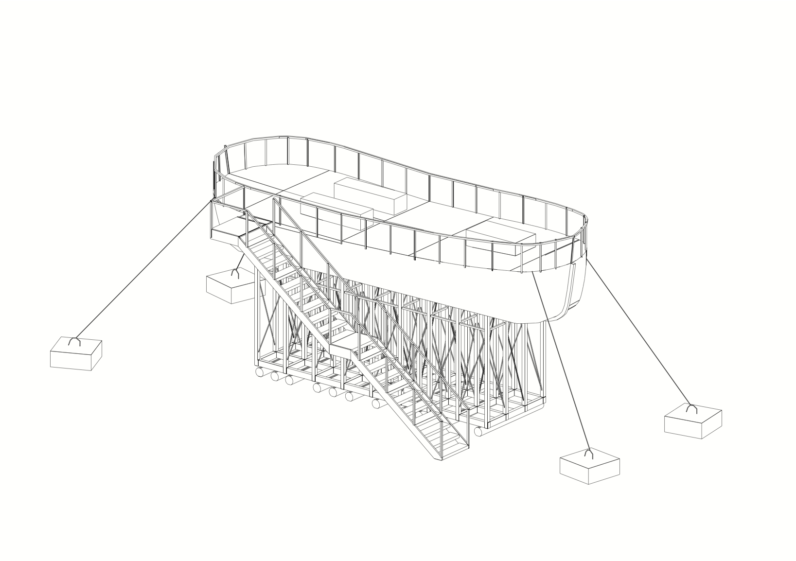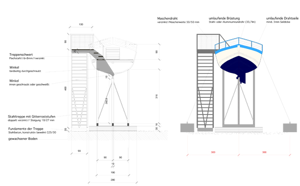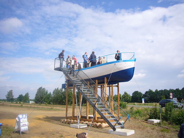 An artificial lake landscape is emerging on the site of a former open cast mine in the south Lusatia area. The “Overland Boat” is a mobile lookout platform from which the construction of the canal that will connect the Senftenberg and Geierswald lakes can be observed by visitors and residents. The boat will be transferred to the most interesting parts of the canal’s construction while it is being built. It will be put into the water at a celebratory ceremony once the canal has been completed.