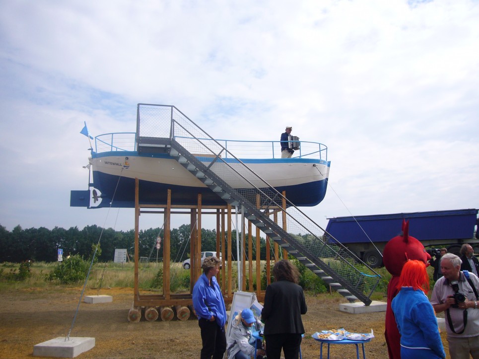 zwischen Senftenberger See und Geierswalder See von Gästen und Anwohnern verfolgt werden kann. Während des Kanalbaus wird das Boot an die jeweils interessanten Bauabschnitte versetzt. Zur Fertigstellung des Kanals wird es in einer feierlichen Zeremonie zu Wasser gelassen.