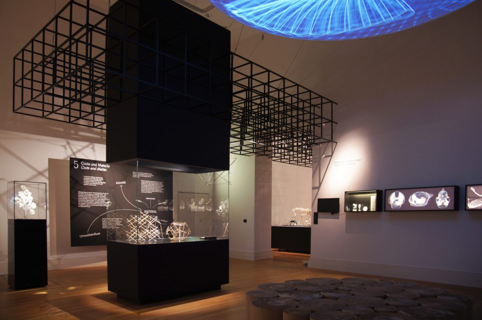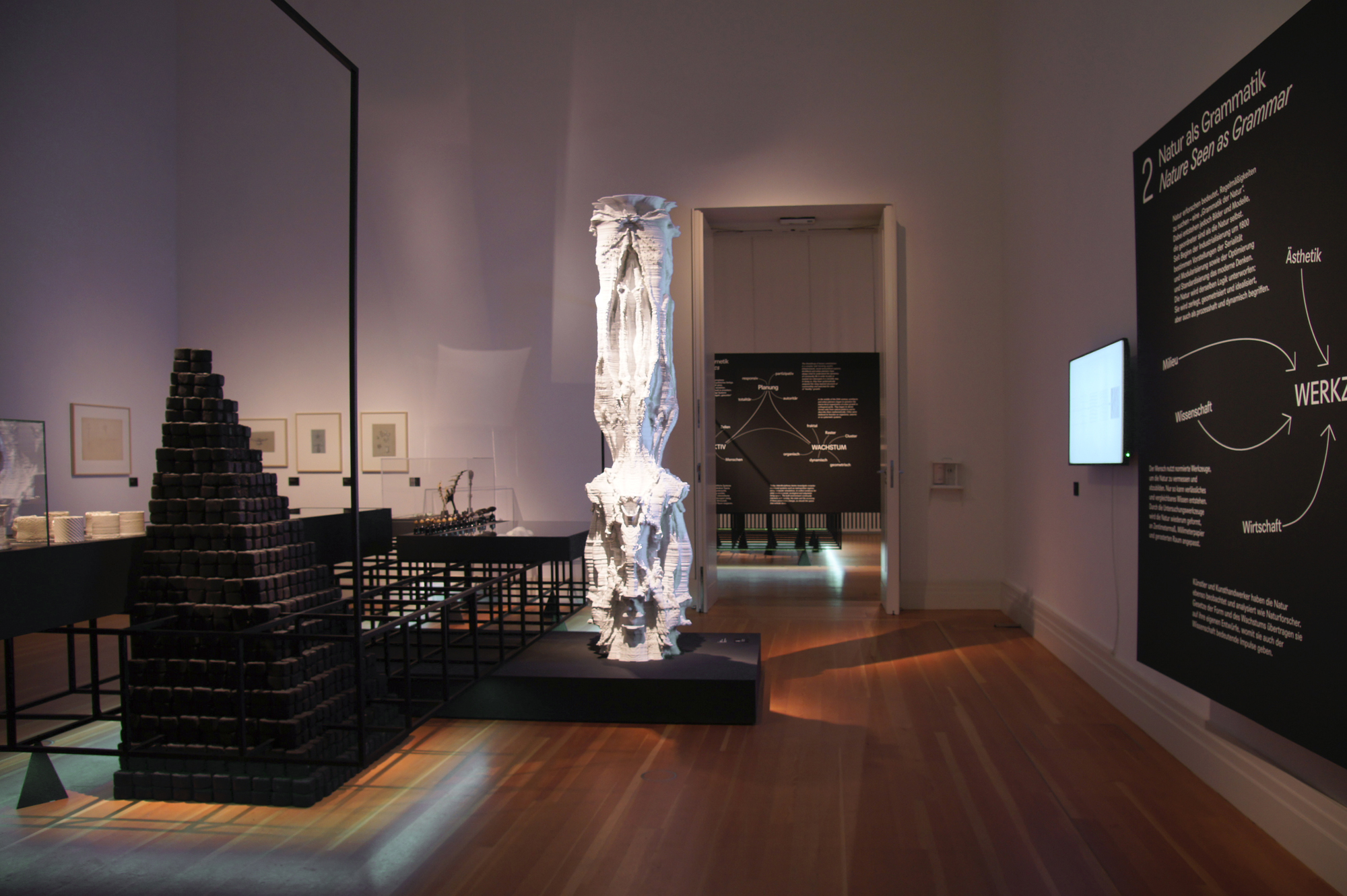 Ausgehend von diesen Betrachtungen stellen wir den Blick auf das Material in den Mittelpunkt der Austellungsarchitektur und Szenografie. Eine Abfolge von Raumcollagen zeigen das Spannungsfeld von Wissenschaft, Natur und Gestaltung auf.
