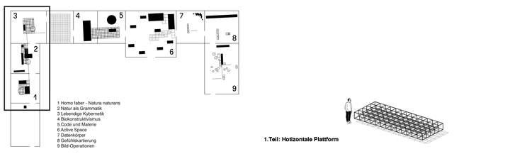 Activ Space: Als kommunikativer Austauschort befindet sich im Zentrum der Ausstellung der Activ Space, welcher aktuelle künstlerische Forschungsarbeiten zeigt und als Verannstaltungsort für die HU Berlin während der Ausstellungsdauer dient. Besucher sind eingeladen an den Vorlesungen, Workshops und Diskussionen teil zu nehmen.