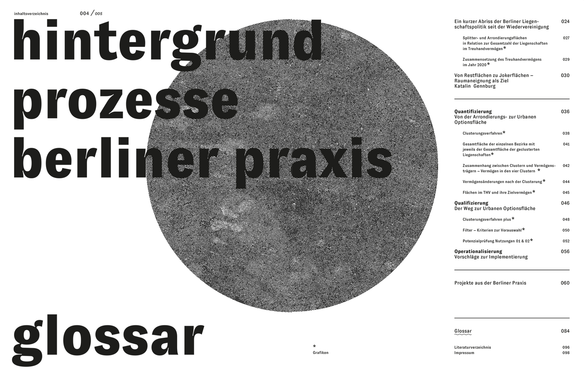 Die Studie befasst sich mit der Erkundung von sogenannten „Arrondierungs- und Splitterflächen“. Dieses ist eine Flächenkategorie im Betrachtungsverfahren des Landes Berlins von öffentlichen Flächen und Gebäuden, die als nicht zu verwerten deklariert werden. Die Studie arbeitet die Verfahrensweisen des Landes Berlins bezüglich seiner Liegenschaftszuordnung, Clusterung, auf und erarbeitet eine neue Flächenkategorie, deren Nutzung und Vergabe. Das Ziel ist die Erschließung von neuen Flächen für gemeinwohlorientierte Nutzungen (für Kunst, Kultur, aber auch Soziales, Bildung und besonderes Wohnen). Im Zentrum der Studie steht ein transparenter und nachhaltiger Umgang mit den Berliner Liegenschaften.