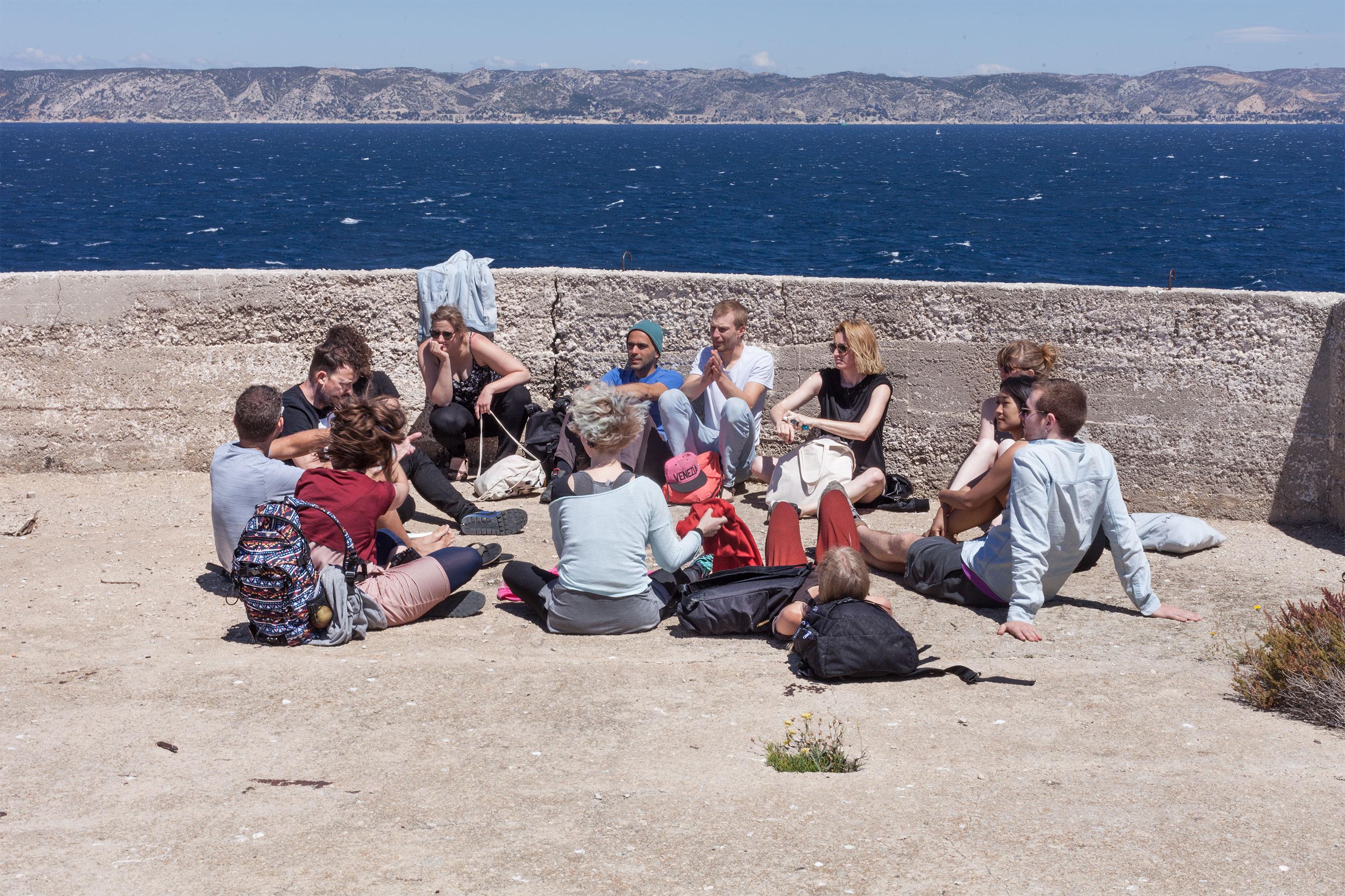 In Marseille, USR walked the GR2013 -the first metropolitan and artistic hiking trail- developed by Bureau des Guides, visited Le Corbusier’s Cite Radieuse with artist Hendrik Sturm and met activists from l’Assemble de la Plaine that are currently fighting displacement in the city centre. The discursive dinner was hosted by Marseille 3013 – the collective behind the Off Festival – including presentations from David Escobar, Olivier Bedu and Redha Califano. The excursion also included a beach moment with collectif etc, a class meeting on the Frioul islands – former Republique Libre du Frioul- and an afternoon at La Friche Belle de Mai. Last but not least, USR participated in an agitated discussion with Métro Euromediterranée Gantès’ chief of economics about Marseille’s real state future and joined a workshop organized by Perrine Boissier on „Shifting Debates“.