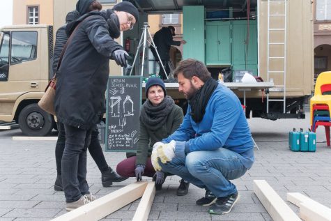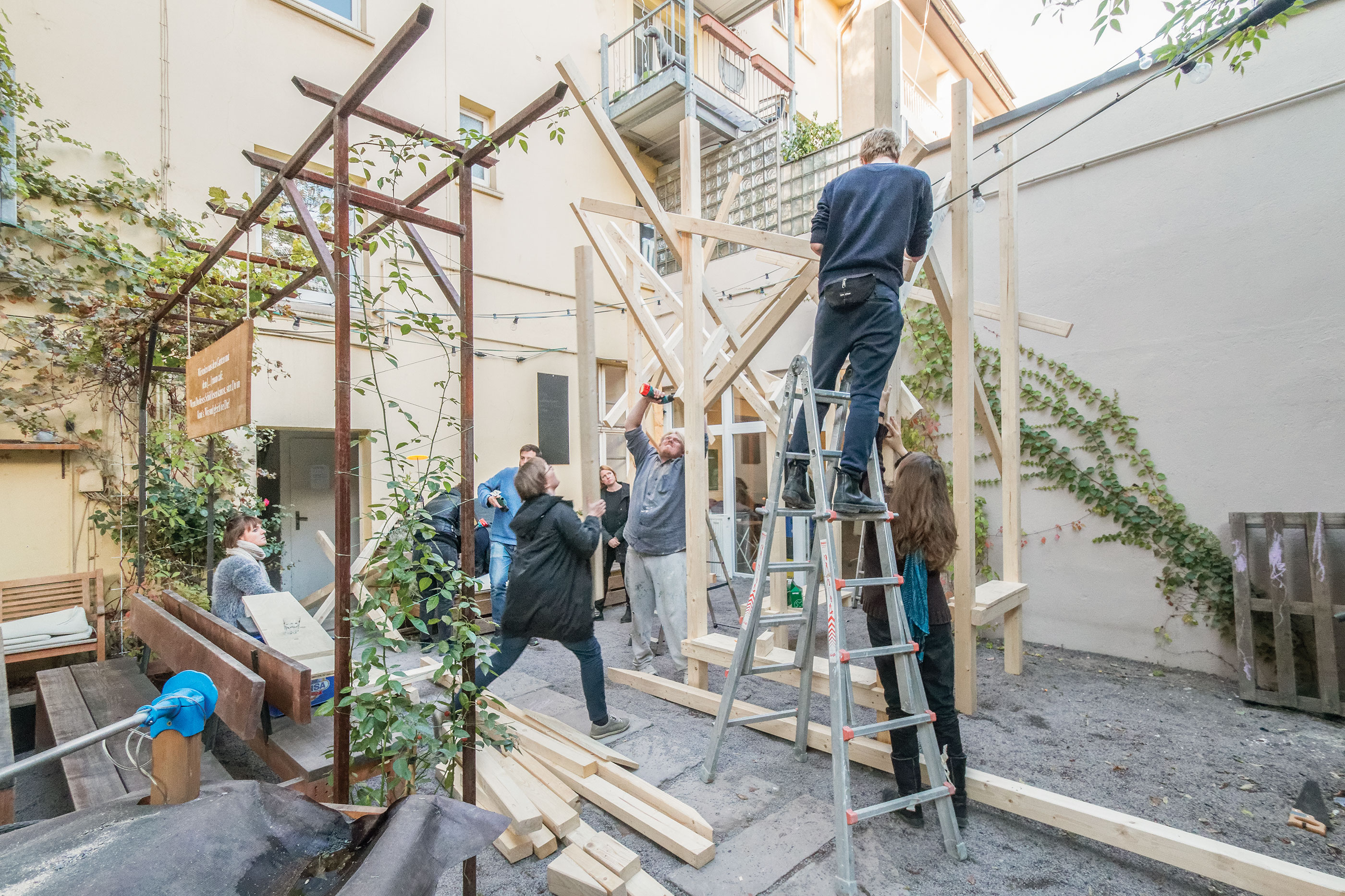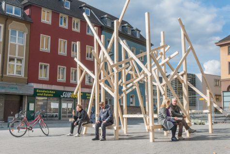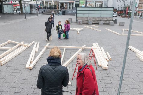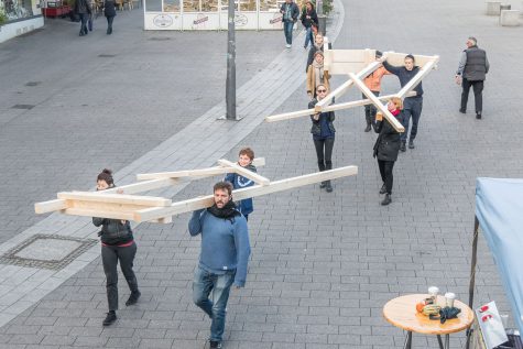 It unfolded during three days throughout a series of exercises with wood elements in Witten’s main public square that tested decision making in two phases: p2p – a design and construction of a portico between two persons- and g2g – a negotiation process between the group to erect a temporary free standing structure with the elements previously p2p built.