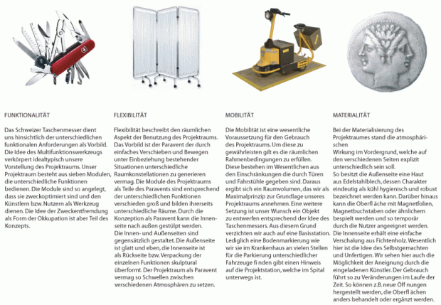 In the Triemli Hospital, we finally discovered the break room as a place with a specific atmosphere. The charm of the improvised and home-made, contrasting with the very functional atmosphere of the lobby. I was feeling as if I was in another place – only a look at the ceiling reminding me of the actual situation. This opposition in the atmospheres is the base of our conceptual thinking.