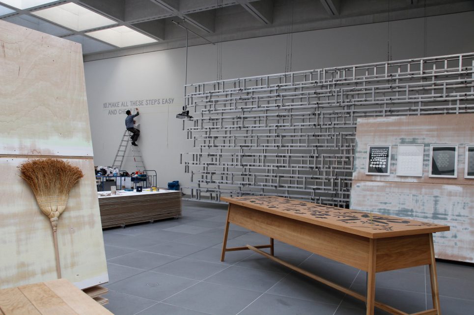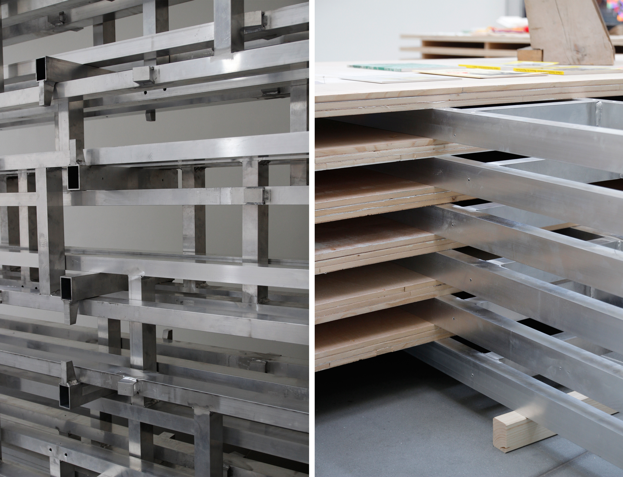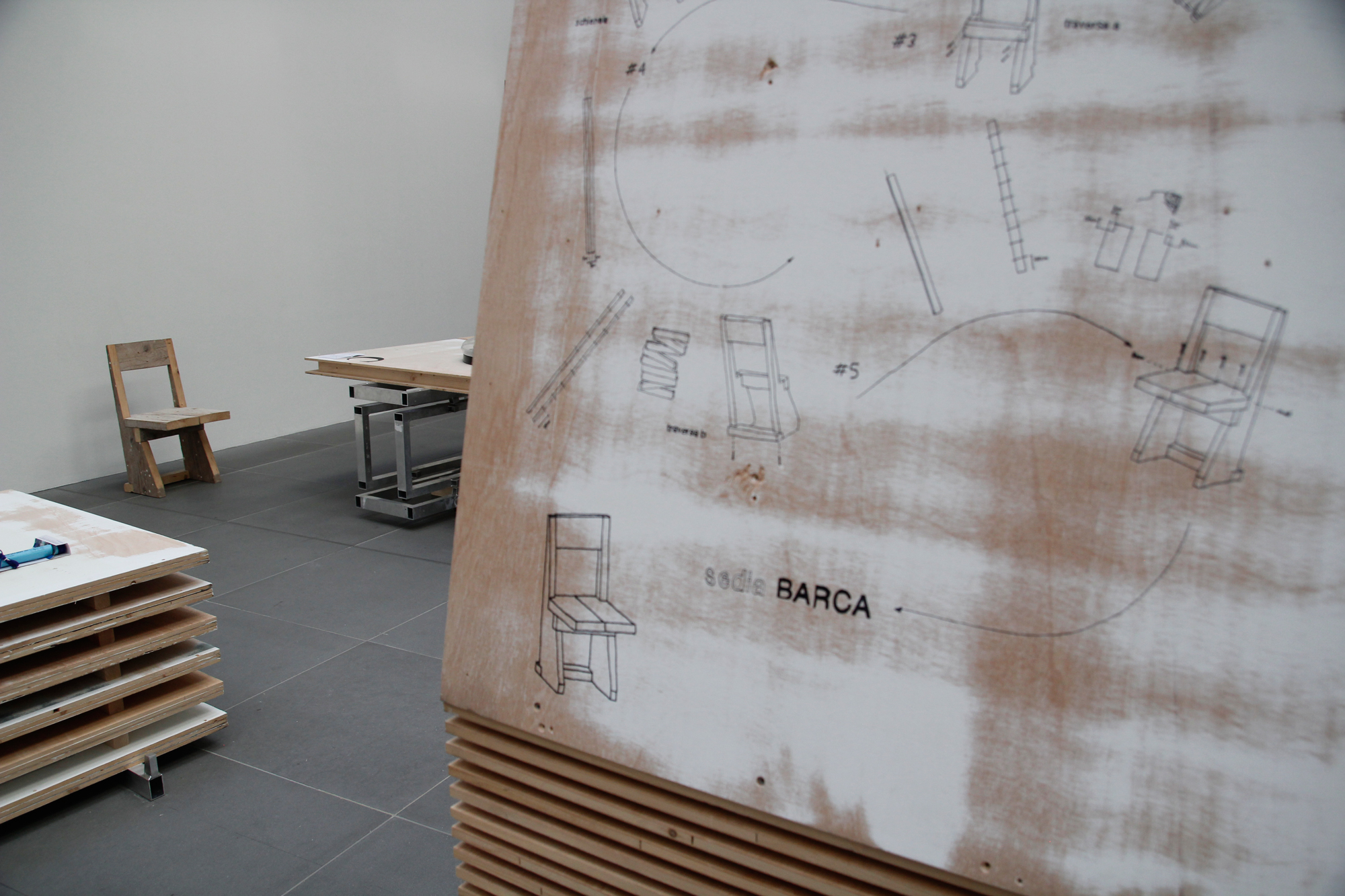 Aus dem Katalog: …Die Ausstellungsarchitektur ist zugleich Display wie künstlerische Intervention, Informationsträger und gleichermaßen Denkmodell: Aus Vorhandenem Neues gestalten und damit ästhetisch Anderes zu kreieren. Das Architektenteam hat die vorhandenen Ausstellungswände des Neuen Museums, das so genannte Wolfsburger System, in seine Einzelteile zerlegt und die abgeschliffenen Platten und Aluminiumträger anschließend in neuer Sortierung als Stapel, konische Wände und Leiter Podeste zu funktionalen Raumelementen von skulpturaler Schönheit wieder aufgebaut.