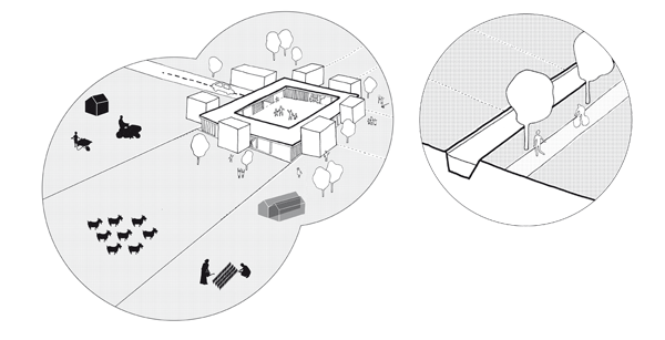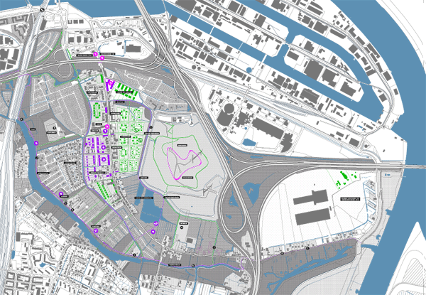 Zwischen den einzelnen Teilräumen ist ein engmaschiges Fuss- und Radwegnetz vorgsehen, dass sich an den örtlichen Gegebenheiten der Wettern und Gräben orientiert. Innerhalb dieses Netzes ist ein Rundweg entlang der Wettern eine wesentlicher Baustein, der nicht nur die Grenze zwischen dern Nachverdichtugsräumen und den Naturräumen definiert, sondern diese als Pendant zum Damm miteinander vernetzt