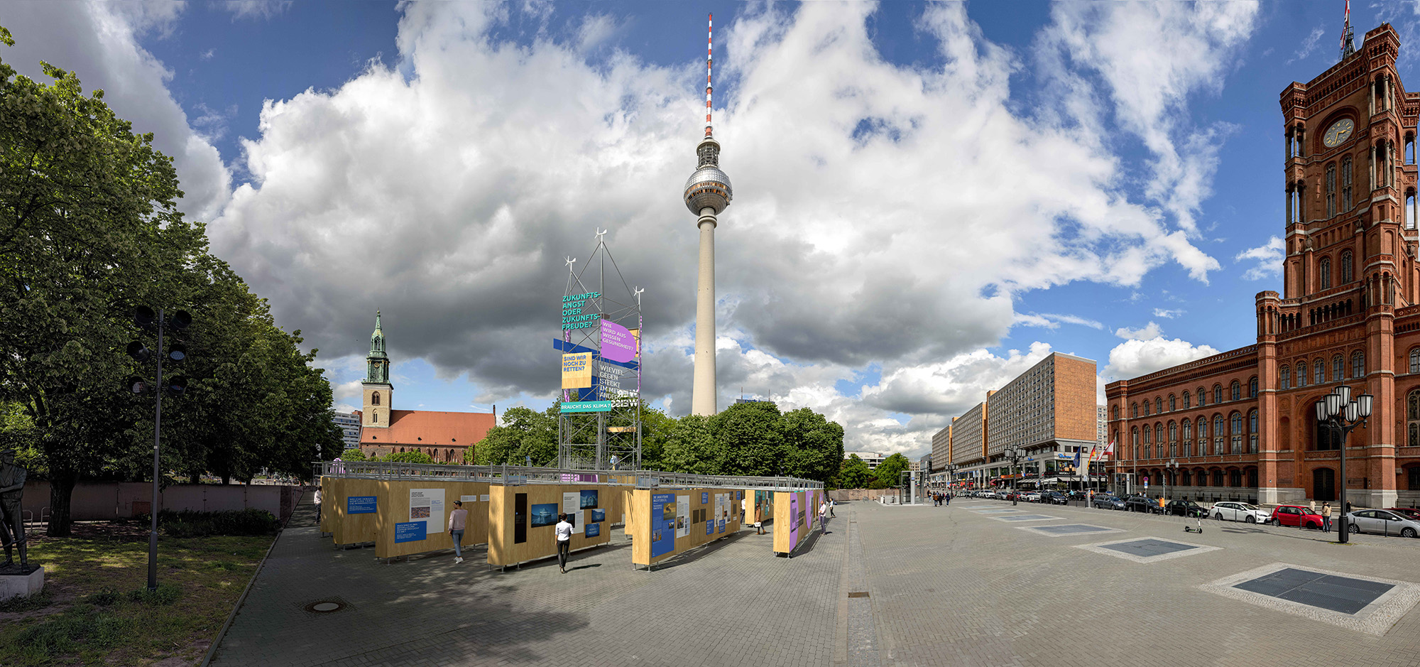 Die große Open-Air-Ausstellung von Kulturprojekte Berlin vor dem Roten Rathaus stellt Fragen und gibt mit einem vielfältigen Programm zu den Themen ‚Gesundheit‘, ‚Klima‘ und ‚Zusammenleben‘ auch Antworten — wissenschaftlich fundiert, politisch kontrovers und gesellschaftlich relevant. Die Ausstellung ist in drei thematisch voneinander abgegrenzte Stadtviertel gegliedert. Das Stadtviertel zum ‚Klima‘ beschäftigt sich chronologisch mit dem Wissen um die Klimaschädlichkeit von CO2 und seine Folgen und beleuchtet in sieben Schlaglichtern, wie der Klimawandel schon heute spür- und messbar ist. »Bleib gesund!« – seit 2020 ist dieser Satz allgegenwärtig. In einem Close-Up von der Einzelzelle bis zum Planeten stellt die Ausstellung in diesem Quartier eine Vielzahl von Herangehensweisen an das Thema ‚Gesundheit‘ vor. Und kommt so vielleicht einer Antwort auf die Frage näher: Woran kranken die gesellschaftlichen Verhältnisse eigentlich? Das Stadtviertel ‚Zusammenleben‘ beginnt unter dem Pflaster, führt durch die Straßen und über die Plätze und eröffnet schließlich den Blick auf die Stadt in ihrer baulichen, gesellschaftlichen und digitalen Entwicklung. Ausgehend vom Standort der Ausstellung, dem historischen Zentrum der Stadt, zeigt sie in acht Kapiteln verschiedene Facetten des Zusammenlebens durch die Linse der Wissenschaften.