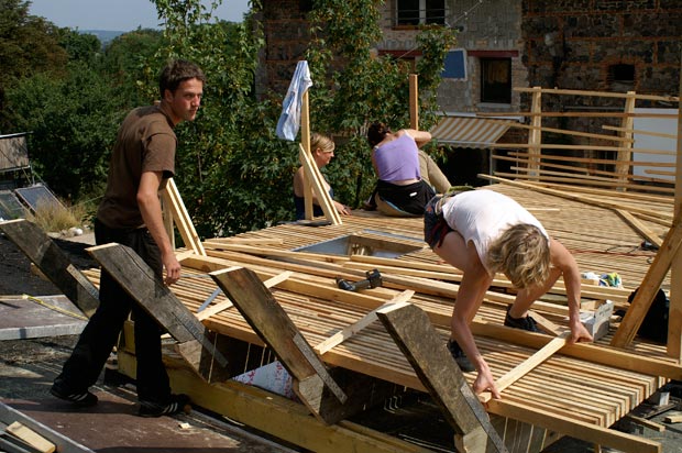 In 2006 we held our first workshop on experimental building in Stolzenhagen. The participants, from the areas of architecture, design, craftwork and psychology, took part in a discussion on experiment in rural and urban building, life and residence. The group built a roof terrace on top of an empty stable building. This wooden construction serves as both a retreat and a lookout platform and is the perfect place for reading, sunbathing and picnicking.