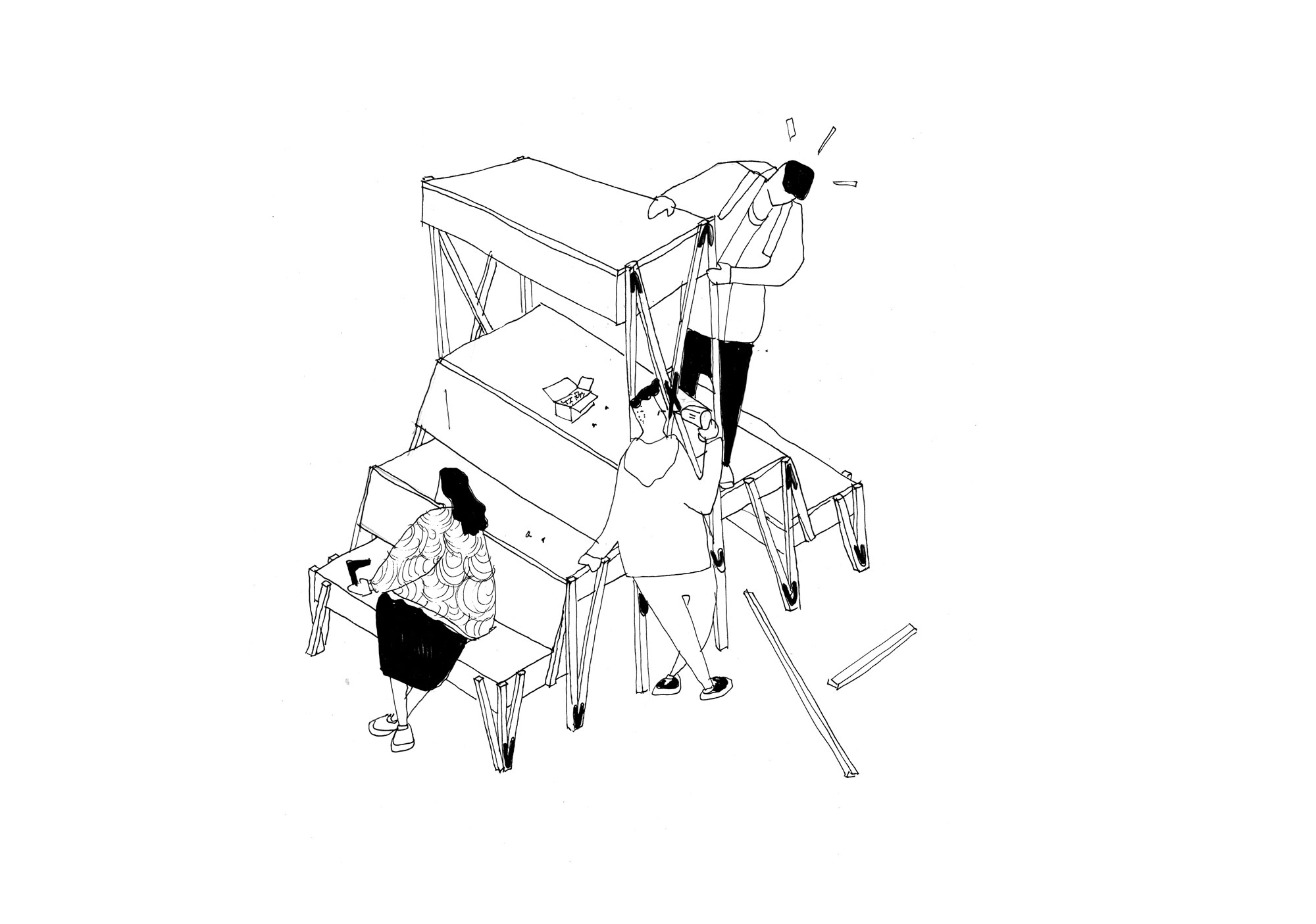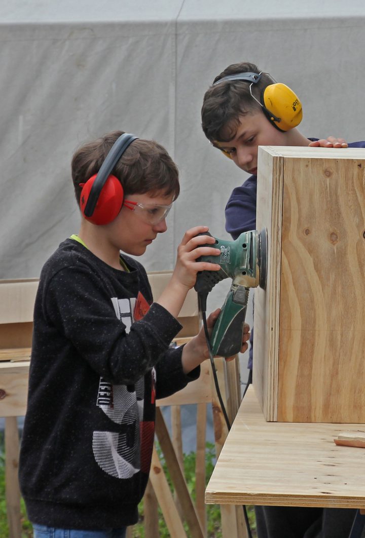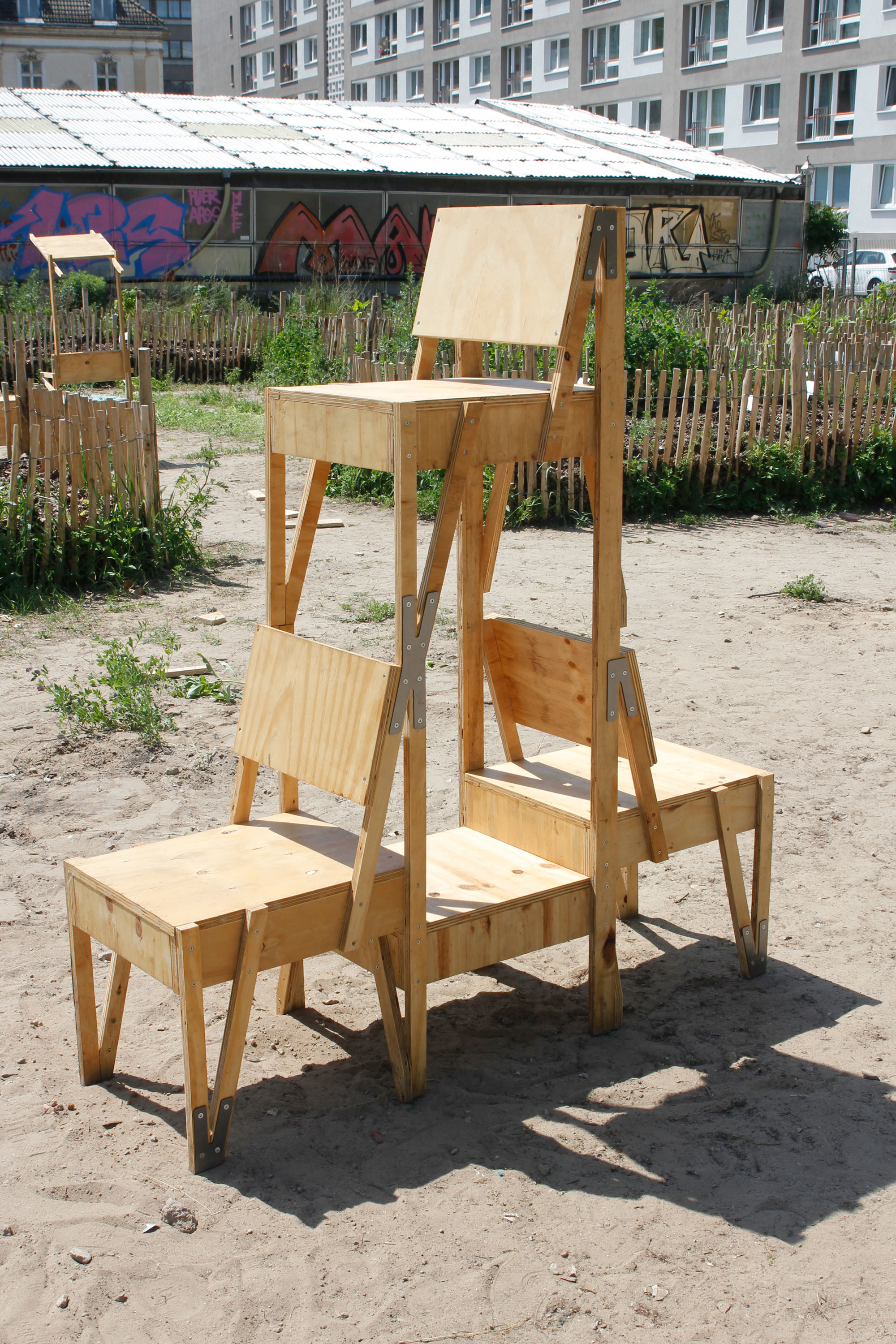 Wir wir in Zukunft zusammenleben wollen wurde auch beim Möbelbau-Workshop diskutiert. Den SchülerInnen standen verschiedene Module zur Verfügung, mit denen sie Sitzmöbel bauen konnten. Der Schwerpunkt des Workshops lag auf der Erforschung des Raumes: Die TeilnehmerInnen sprachen über Komfortzonen, Nähe, Fremde und Begegnungen mit Unbekannten und entwickelten zusammen unterschiedliche Möbelkonstellationen.