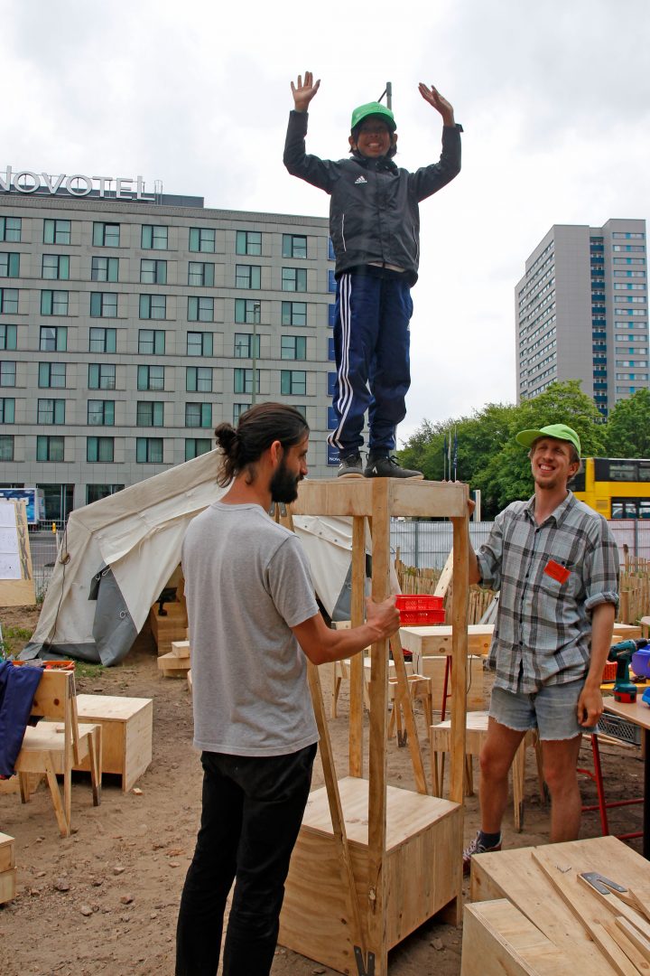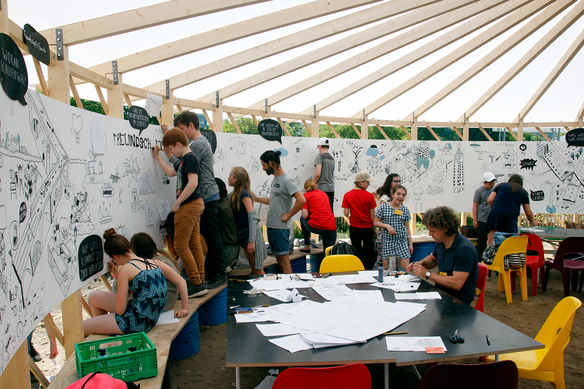 In den ersten Maiwochen testeten junge Menschen in verschiedenen Workshops, was das House of One alles sein kann. Die SchülerInnen im Alter zwischen 10 und 15 Jahren spielten Theater, schrieben ein Lied, bauten Möbel und zeichneten einen Riesencomic auf die Innenseite, des in Holz ausgekleideten Pavillons. Die Workshops liefen jeweils über zwei Tage und es wurde viel diskutiert, hinterfragt und produziert.