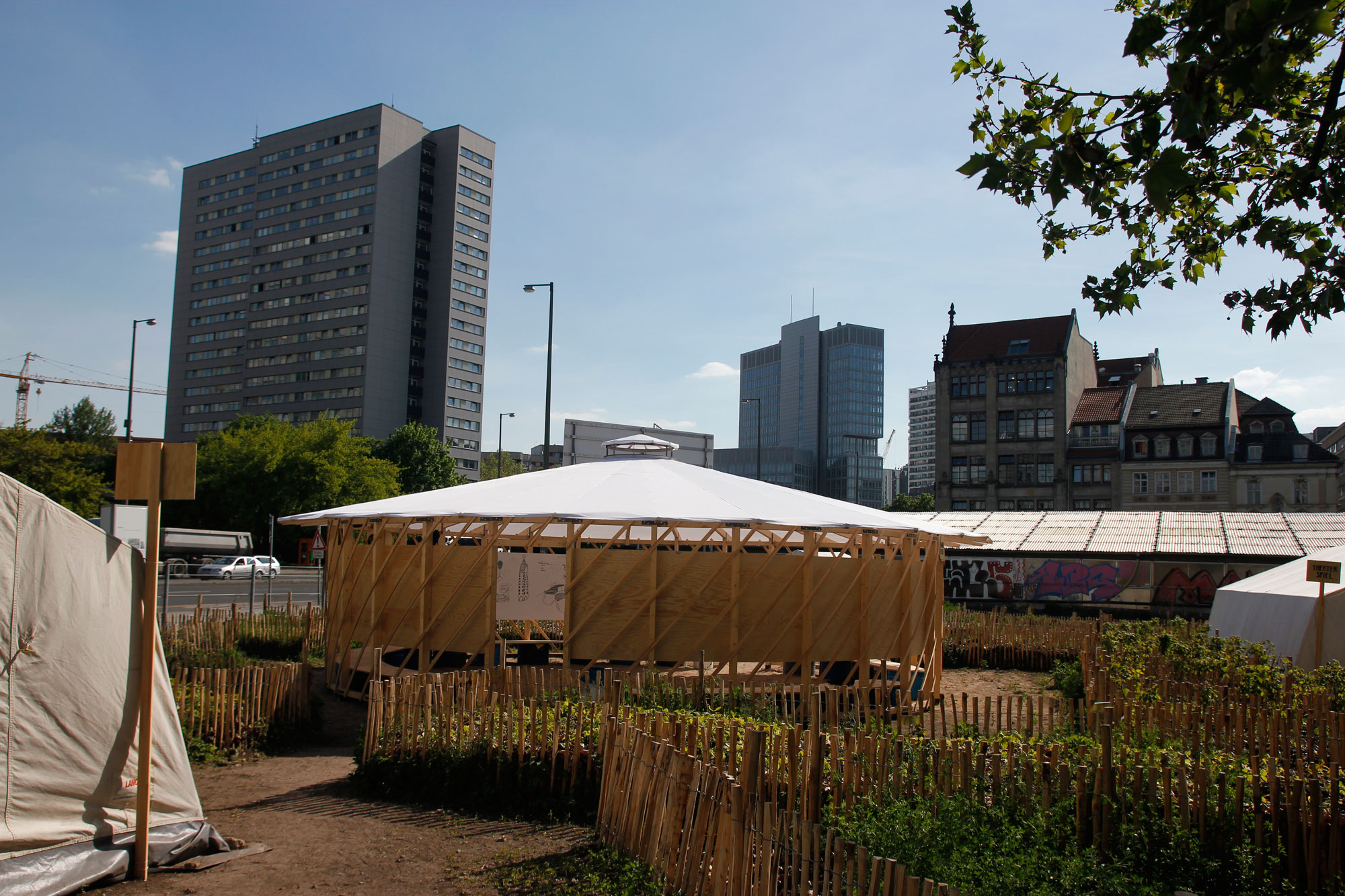 Raumlaborberlin designed, inspired by the circular center of the House of One, a wooden pavillon. The pavillon opens up to the three other places of the area. It worked as the central meeting point during the breaks in the workshops.
